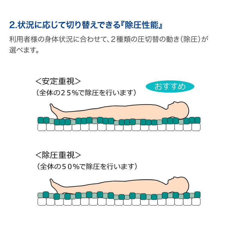 ●サイズ/幅83×長さ193×高さ17cm●重さ/10kg●材質/マット:ウレタンフィルム、カバー:伸縮性ウレタン合皮●電源/AC100V 50/60Hz 58W●ポンプ定格/ポンプ内蔵式●最大使用者体重/150kg●防水加工、MRSA制菌加工 ・さまざまな身体状況の利用者様へのケアに最適な特性で対応する、人の手で行うような優しい自動体位変換機能を備えた高機能エアマットレス。・体圧分散式マットレスに求められる重要な8つの特性を備えています。・体圧分散式マットレスの基本特性である、「体圧分散性能」「除圧性能」「ずれ力対策」を向上しました。・体圧分散式マットレスの弱点である、「寝心地」「。座位安定性」「むれ」「ひえ」を対策しました。・+αとして、「体位変換」の機能を保持しています。 【モルテン】 【当店について】 当店は高知県に所在している介護用品や福祉用具をメインに取り扱っているショップです。在庫品もたくさんご用意しています。各エリアに倉庫拠点を置き、全国のお客様へいち早くお届けできるよう在庫を取り揃え、配送までの日数を極力お待たせすることないよう体制を整えています。(各メーカーから直送させていただいたり、メーカーより取り寄せ後発送する商品もございます)シニア層のお客様に人気のある商品や、介護現場での必要不可欠なグッズ、アイディア用品、便利グッズなどもご用意しており、ご好評いただいています。紙オムツなど医療費控除対象商品も数多く取り揃え、一度にたくさん購入が必要な場合は、ケース出荷での対応も行っております。まとめ買いや大量購入、病院や施設での備蓄にとお買い求めいただいています。ご購入前にお見積りのご要望がございましたら、作成もご相談受け付けておりますので、お気軽にお問い合わせください。 【当店では以下のような商品を取り扱っております。】 [食事関連] 介護食 健康食品 栄養補助食品 ハイカロリー 高カロリー 区分1 区分2 区分3 区分4 容易にかめる 歯ぐきでつぶせる 舌でつぶせる かまなくてよい ドリンク お箸 スプーン フォーク グリップ カフ 食器類 すべり止めシート カップ吸い飲み器 調理器具 オーブナー ロ腔ケア用品 食事用エプロン 飲料 飲み物 栄養補助ゼリー ゼリー飲料 自助具 カトラリー コップ お皿 オーラルケア 歯ブラシ 歯ぶらし 歯磨き 入れ歯洗浄 食事用前掛け [入浴関連] シャワーチェア 浴槽台 浴槽手すり 浴槽ポード バスリフト バスマット バスシート シャワーキャリー 入浴用 介助ベルト すのこ 入浴用クッション 防水力バー エプロン 入浴エプロン 介助用エプロン シューズ シャワー付チェア 簡易浴槽 入浴用担架 入浴用小物 入浴剤 清拭料 ボディーソープ シャンプー 保湿剤 清拭タオル 風呂いす お風呂椅子 バスボード シャワー用車いす 入浴介助エプロン お風呂マット 滑り止めマット すべり止め 転倒予防 クッション 業務用入浴剤 ドライシャンプー ウェットタオル [ベッド関連]べッド サイドレール サイドテーブル べッド用手すり カバー 衝撃吸収マット 枕 寝具 エアマット マットレス オーバレイ 介助ベルト 移乗用具 移乗グロープ 介護リフト シーツ 防水 除湿 非防水 べッドバッド 体位変換クッション セーフティー用品 電動ベッド 介護ベッド 介助バー Pバー ピロー 介護クッション ベッド柵 転倒予防 座位保持 端座位 床ずれ用品 褥瘡 除圧 [衣類] 寝巻き 肌着 衣類 紙おむつホルダー 失禁バンツ 防寒具 帽子ソックス サポーター コルセットルームウェア アンダーウェア 下着 トップス ボトムス アウター チュニック ベスト カーディガン 羽織り 寒さ対策 軽失禁パンツ 尿漏れパンツ 靴下 くつした サポーター 腰用 膝用 足用 足首 背中 手首 肩 肘 [歩行関連] 車いす 電動車いす 車いす用クッション 座位保持用具 車いす用小物 スロープ 電動昇降機 歩行車 歩行器 シルバーカー ショッピングカート ウォーキングボール 杖 多点杖 松葉杖 クラッチ 杖小物 ゴムチップ リハビリシューズ 靴下 靴した ソックス スリッパ 室内履き 外履き 入院 施設用 病院用 シューズ シューズ小物 転倒予防 ヘッドガード 車いす用オプション 歩行補助器 四輪 手押し車 カート 買い物カート シニアカー ステッキ 四点杖 4点杖 杖先ゴム 介護シューズ コンフォートシューズ ウォーキングシューズ ヘッドギア 頭部保護帽 帽子 車椅子体重計 [排泄関連]ポータブルトイレ プライベートスクリーン 簡易便座 トイレ用手すり 補高便座 便座シート トイレマット トイレ用雑貨 消臭剤 汚物処理用品 紙おむつ おむつ オムツ パッド 尿取りパッド 尿器 おしり洗浄液 シャワーポトル おしりふき 紙おむつ処理袋 採尿器 差込便器樹脂製トイレ 木製トイレ 家具調トイレ 目隠しスクリーン トイレ用手摺り 補高補助便座 トイレシート 消臭フォーム 消臭スプレー おむつ処理袋 尿漏れパッド サニタリー用品 トイレットペーパー シングル ダブル 使い捨て [住宅改修]玄関台 段差解消スロープ すべり止め小物 取っ手 玄関用へンチ 置き型手す