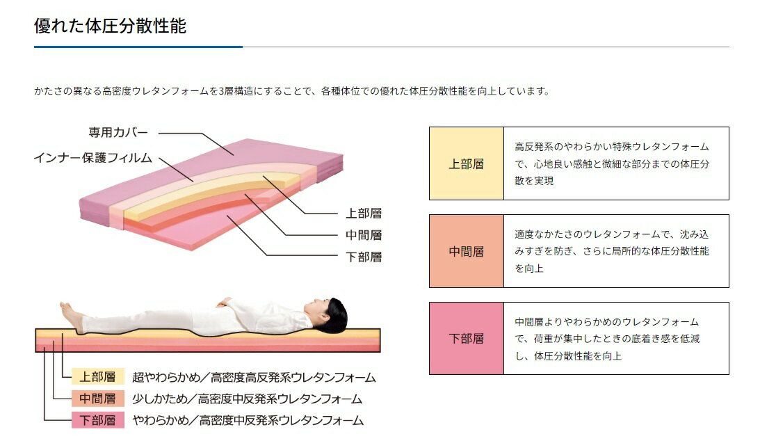 ・長時間維持する優れた体圧分散性能を持つ3層式高密度ウレタンフォームマットレス。 ・かたさの異なる高密度ウレタンフォームを3層構造にすることで、各種体位での優れた体圧分散性能を向上させています。 ・中間層の両サイドのかためのウレタンフォームにより、端座位の安定性を向上させ、ずり落ち対策をしています。 ●サイズ/幅91×長さ180×高さ13cm ●重さ/9.3kg ●材質/マット:ウレタンフォーム、カバー:ウレタン合皮(制菌仕様)、インナー保護フィルム:PVC ●防水加工