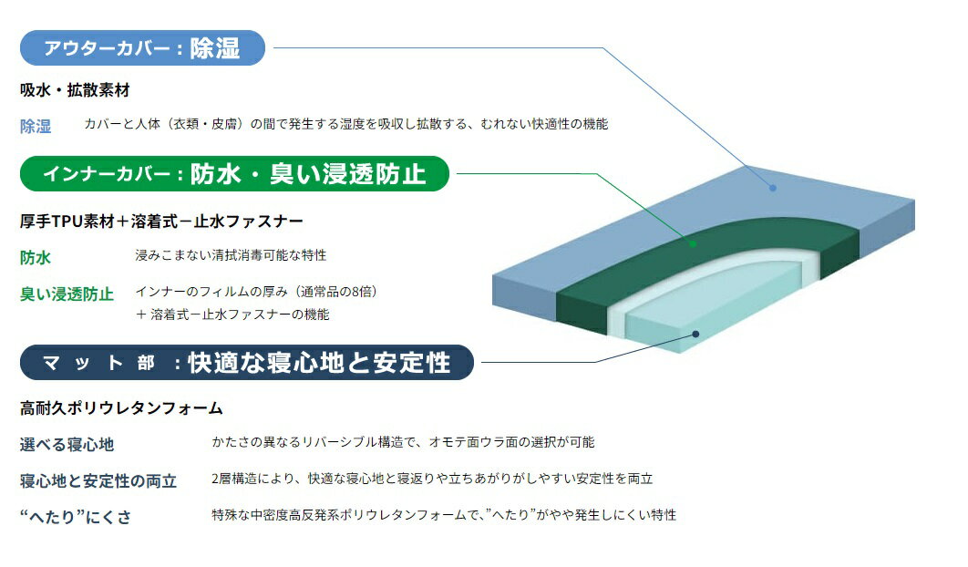 「快適な寝心地と安定性を両立した」特殊寝台付属品マットレス 快適・衛生タイプ やさしい肌ざわり・いつもサラサラ を提供する専用の除湿カバー かたさの異なるリバーシブル(両面)構造です やわらかめのオモテ面とかためのウラ面を好みで使い分けることができます 特殊な中密度高反発系ウレタンフォームにより、長期間使用による“へたり”をやや発生しにくくしています サイズ・重量 レギュラー91cm 幅91×長さ191×厚さ10cm 7.1kg レギュラー83cm 幅83×長さ191×厚さ10cm 6.6kg ショート91cm 幅91×長さ180×厚さ10cm 6.6kg ショート83cm 幅83×長さ180×厚さ10cm 6.1kg