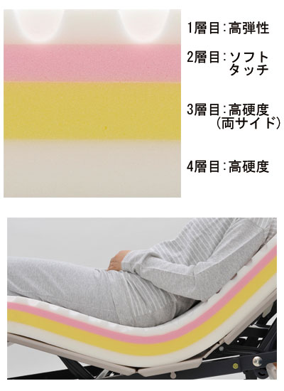 ・寝心地、動きやすさを重視した4層構造のウレタンフォームマットレス。 ・4種類・4層構造ウレタンフォーム (1層目:高弾性、2層目:ソフトタッチ、3層目:高硬度(両サイド)、4層目:高硬度)。 ・底づきを防ぎ頭側挙上も安心。 4層目には、しっかりと体重を保持できる高硬度ウレタンフォームを採用。 頭側挙上時の姿勢を保持し、臀部の底づきを防ぎます。 ●サイズ/幅83×長さ180×厚さ10cm ●重さ/5.4kg ●材質/マット:4層構造ウレタンフォーム、カバー:ポリウレタンフィルムラミネート加工布 ●生産国/日本 ●防水加工、制菌加工 ●メーカー品番/CR-364 ●JANコード/4939810008493 ●メーカー名/ケープ