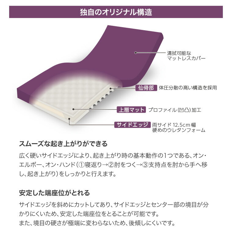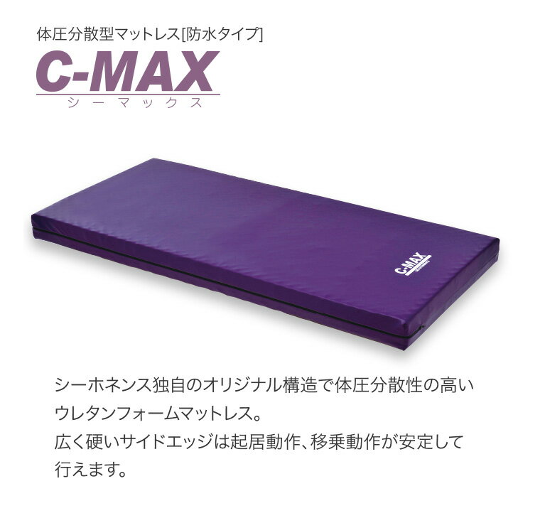 ※個人様宅への配送はいかなる場合もできかねます。何卒ご容赦下さいませ。 ●サイズ/幅90×長さ191×厚さ12cm●重さ/7.6kg●材質/カバー表:ポリエステル、裏:ポリウレタン、中材:ウレタンフォーム●抗菌加工、防水加工、難燃加工※ベッド本体とセット購入時非課税となります。・「寝かせきり介護」ゼロを目指して。・清拭可能なマットレスカバー。・上層マット:プロファイル(凹凸)加工。・サイドエッジ:両サイド12.5cm幅、硬めのウレタンフォーム。・仙骨部:体圧分散の高い構造を採用。・シーホネンス独自のオリジナル構造。・起居動作・移乗動作が安定しておこなえる広く硬いサイドエッジ。【シーホネンス】体圧分散型マットレス[防水タイプ] C-MAX 90cm幅 83cm幅はこちら C-MAX 83cm幅 その他「マットレス」はこちら ≫