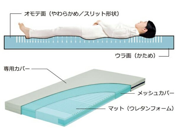■特長 ・好みに合わせて選べる寝心地 かたさの異なるリバーシブル(両面)構造です。 やわらかめのオモテ面とかためのウラ面を好みで 使い分けることができます。 ・寝心地のよさと寝返りのしやすさ 頭部・足部は小さなスリットで体をやわらかく支え、 背中〜大腿部は大きなスリットで体の沈み込みを抑えることで、 寝心地のよさと寝返りのしやすさを両立しています。 ・“へたり”にくさ 特殊な中密度高反発系ウレタンフォームにより、 長期間使用による“へたり”を発生しにくくしています。 ※“へたり”とは・・・ マットレスを長期間使用した場合に起こる劣化現象で、 変形して元に戻らなくなり「体圧分散性能が低下」してしまいます。 ■ムレ環境を改善(通気・洗浄消毒タイプ) ・ムレ環境を改善する通気カバー 快適性を考慮した通気カバー。 汗や水分を素早く吸収拡散し、いつもサラサラで快適な状態を保ちます。 ・カバーの丸洗いが可能 専用カバーは取り外して洗濯機で丸洗いすることができます。 ■仕様 サイズ:幅100×長さ191×厚さ10cm