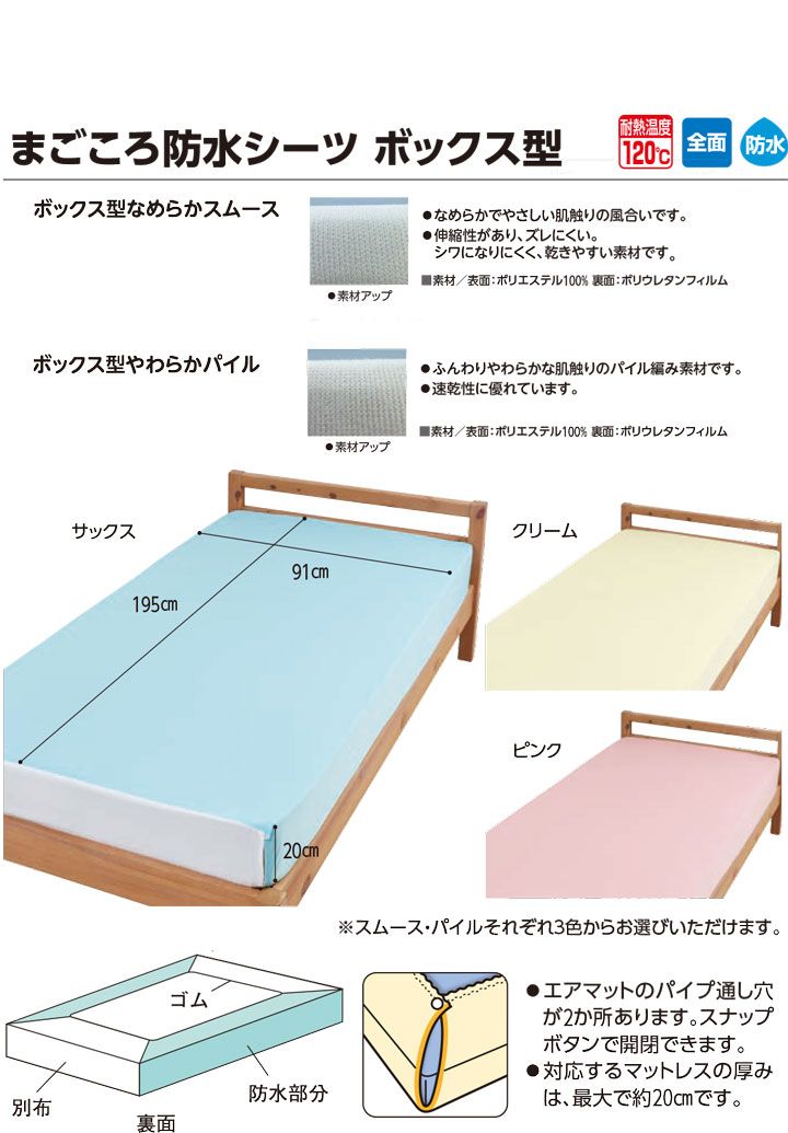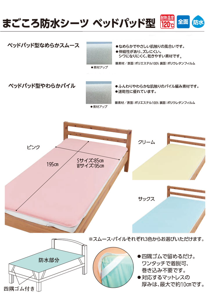商品の特長 まごころ防水シーツは、介護現場やご家庭での毎日に寄り添う、 使いやすさと価格を両立した防水シーツです。 ・水分をしっかり防ぐ安心の防水加工 ・肌ざわりが選べる3素材(スムース/パイル/デニム調) ・洗濯機で丸洗いOK、乾きやすくお手入れ簡単 ・ベッド、布団どちらにも使いやすいサイズ設計 選べる3つの素材 【スムース】 伸縮性があり、シワになりにくい。寝返りが多い方におすすめ。 【パイル】 ふんわりやさしい肌ざわり。吸水性が高く快適。 【デニム調】 しっかりした生地でズレにくく、介護用途に最適。 サイズ・カラー サイズ:90×145cm / 90×170cm カラー:クリーム / サックス / ピンク ※ベッド、布団どちらにも対応 こんな方におすすめ ・介護中の失禁、尿もれ対策に ・おねしょ対策として ・洗い替え用をまとめて揃えたい方 ・コストパフォーマンスを重視する方 ・介護現場でも使われている定番仕様 毎日使うものだからこそ、使いやすさと耐久性を重視しました。 安心して使えるポイント 防水層:ポリウレタンフィルム 表面素材:ポリエステル100% 洗濯機使用可能(洗濯ネット推奨) 繰り返し使えて経済的 介護用品を扱うメーカー基準で作られた、安心して選べる防水シーツです。 【まとめ買いでさらにお得】 毎日使うものだから、洗い替えがあると安心です。