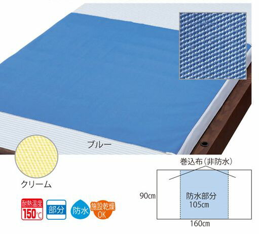 ・防カビ加工 ・業務用にも使用される定番の防水シーツです。 ・丈夫で長持ちしますので経済的です。 ・乾燥機も使用できます。 ・耐熱温度150°。 ●カラー ブルー (クリームは廃番商品となりました) ●サイズ 90×160cm 防水部分:105cm ●材質 表地:ポリエステル65%・綿35%■防カビ加工 人気のデニムタイプ防水シーツがこの価格!