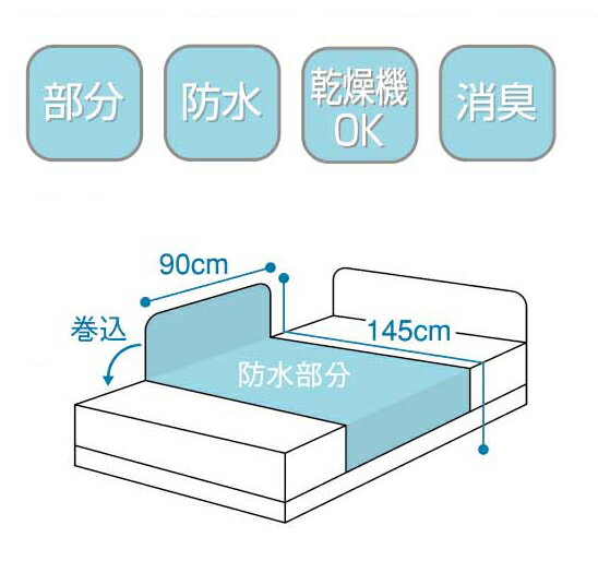 ■サイズ:防水部分90×145cm ■素材:表地/ポリエステル55%・アクリル45% 消臭ポリウレタンラミネート ■洗濯・脱水・乾燥機(80℃)可 [エンゼル]やさしいパイル地 表面は肌にやさしいパイル地を使用。乾きが早く、洗濯 の取り扱いが楽。消臭加工でおしっこの臭いの元を分解