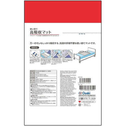 お店TOP>介護>介護用寝具・床ずれ予防>介護用寝具・カバー>使い捨てシーツ>プラスハート 使い捨て高吸収マット 60cm*90cm (6枚入*5袋セット)【プラスハート 使い捨て高吸収マット 60cm*90cmの商品詳細】●洗濯の手間がいらない使い捨てタイプ!●高吸収消臭ポリマーを配合しているため、万一のモレも素早くたっぷり吸収します。●オムツからの尿便モレにも十分な吸収量です。●ダイヤ柄プレスが尿などを拡散させ、より効率的に素早く吸収します。●使い捨てタイプのため、洗濯の手間がありません。●裏面防水シート付きのため、汚れを下に通さず、ベッドが汚れるのを防ぎます。●吸収後は逆戻りせず、さらっとした表面状態を保ちます。●丈夫な表面材を使用しているため、ぬれた後も破れにくくなっています。【使用方法】(1)マットを完全に開き、吸収面が内側になるよう、折り直します。(2)使用者の身体を横向きに寝かせ、お尻がシーツの中心に乗るよう、折り直したマットを敷きます。(3)使用者の身体をゆっくり反対側に向け、マットの吸収面が上になるように引き出します。(4)引き出したマットを広げ、シワができないようにベッド幅の中央に整えます。【規格概要】・素材表面材:不織布吸収材:吸水紙、高吸収ポリマー、綿状パルプ防水材:ポリエチレン・サイズ60cm*90cm(全長)55cm*82cm(吸収部分)※セミシングルベッド、シングルベッド、介護用ベッド(83cm、91cm、100cm幅)に対応【注意事項】★使用上の注意・本品は使い捨てです。くり返し使用しないでください。・高吸収ポリマー入りのため、切っての使用や洗濯は行わないでください。・汚れたシーツは早めに取り替えてください。・電気毛布や温熱器具と併用すると、高温になりマットが溶ける危険性があるため、避けてください。・伸縮性のある素材を使用しているため、規格には誤差が生じる場合があります。★使用後の注意・使用後は汚れた部分を内側にして丸め、トイレには流さず衛生的に処理してください。★保管上の注意・高温・多湿や直射日光の当たる場所を避け、乳幼児の手の届かない所に保管してください。・開封後は、ほこりやゴミなどが入り込まないよう、清潔に保管してください。【原産国】中国【ブランド】プラスハート【発売元、製造元、輸入元又は販売元】オオサキメディカル※説明文は単品の内容です。リニューアルに伴い、パッケージ・内容等予告なく変更する場合がございます。予めご了承ください。・単品JAN:4971032751504オオサキメディカル452-0812 愛知県名古屋市西区玉池町2030120-15-0039広告文責:楽天グループ株式会社電話:050-5577-5043[介護用 就寝用品/ブランド:プラスハート/]