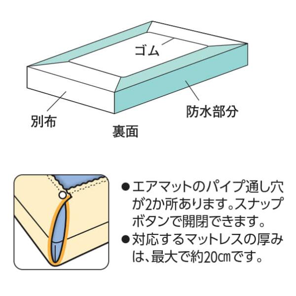 まごころ防水シーツ ボックス型 ・1枚入り ・耐熱温度120℃ ・やさしい肌ざわり ・エアマットのパイプ通し穴が2カ所あります。スナップボタンで開閉できます。 【カラー】 クリーム・サックス・ピンク 【サイズ】 幅91×長さ195cm 対応するマットレスの厚み:最大約20cm 【素材】 表面:ポリエステル100% 裏面:ポリウレタンフィルム 別布:ポリエステル100%