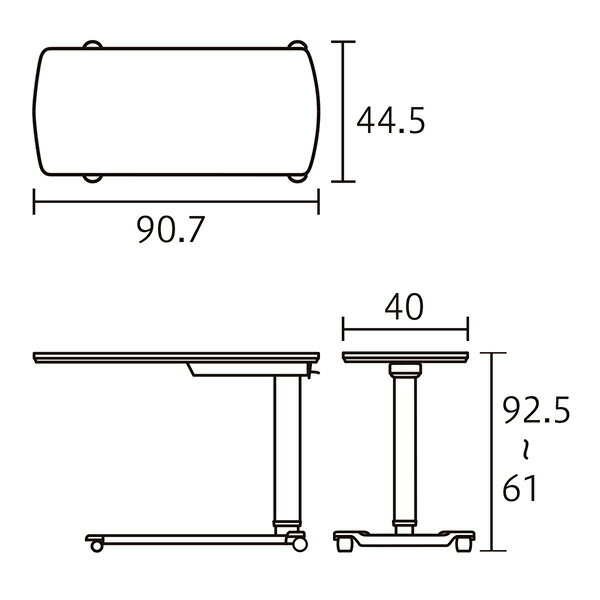 【配送に関してのお願い】 配送希望時間の指定は、できません。 【ご注意ください】 個人様宅配送限定商品となります。個人様宅・個人利用以外の場合はキャンセルとさせていただきます。 ・レバー操作で高さ調節が可能 ・壁ぎわに設置したベッドでも使えるテーブル ・挟まれを予防する上昇方向フリー機構 ・天板は90×40cm ・軟質ウレタンエッジ一体成形 ・脚部が低く、低床ベッドに対応 ・直径3cm、4cmのキャスターを採用 ・天板のサイズは90×40cm。ベッドの上で食事や軽作業が行なえます。テーブルの縁は、優しい感触の軟質ウレタンのエッジを設け、小物が落下しにくいように、テーブル面より少し高くなっています。 ・ガススプリングを採用しているので、レバーを操作するだけでお好みの高さに調節できます。高さは、61-92.5cmまで無段階で調節可能です。 ・安全にお使いいただくために、レバー操作をしなくても下から力が加わるとテーブルの高さがあがる、上昇方向フリー機構を採用しています。 ・脚部には移動用のキャスターを設けています。低床ベッドでも使用しやすいように、脚部の高さを低くした設計です。 ※楽匠Sシリーズと使用する場合には、ハイトスペーサーが必要です。 ※組み立てが必要となります。 ●サイズ/ 幅90.7×奥行44.5×高さ61〜92.5cm 天板:幅90×奥行40×厚さ2cm 脚:幅70×奥行44.5×厚さ4.8(先端側)・5.9(支柱側)cm ●重さ/14kg ●カラー/アイボリー ●材質/ 合成樹脂化粧パーティクルボード・ウレタンエッジ一体形 支柱:アルミニウム 脚:スチール・PP樹脂 ●品番/KF-1920 ●メーカー/パラマウントベッド