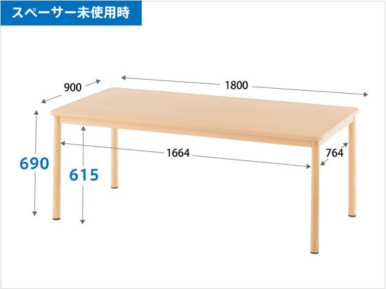【商品説明】傷がつきにくく、水に強い低圧メラミン樹脂天板です。天板の角は丸く、柔らかいソフトエッジを使用し安全性も考慮しています。付属のスペーサーで高さ690mmと741mmの2段階高さ調節が可能です。テーブル下内寸はスペーサー未使用時615mm、スペーサー使用時666mmです。使用しないスペーサーは天板裏に取り付けでき紛失を防止します。脚部は丈夫なスチール製、木目シート貼りです。【仕様】●外寸法:幅1800×奥行900×高さ741mm●天板厚さ:25mm●材質:天板/(表面)低圧メラミン樹脂化粧板(芯材)ペーパーコア(エッジ)PVCソフトエッジ 、フレーム/スチール(粉体塗装)、脚部/スチール(木目転写仕上げ)、アジャスター/PP●質量:28.2kg●耐荷重:天板/約50kg●機能:アジャスター機能、高さ調節機能(2段階)●カラー:ナチュラル●付属品:六角レンチ●組立人数:2人●組立時間:20分●生産国:中国●注文単位:1台※車上お渡しでのお届けのため、配送車両近くでのお渡しとなります。お届けの際に荷卸しのお手伝いをお願いする場合がございます。※こちらの商品は、個人宅の配送は行っておりません。お届け先が個人名様の場合、キャンセルとさせていただきます。お届け先が法人の場合、必ずお届け先に会社名をご記載ください。【検索用キーワード】アール・エフ・ヤマカワ アールエフヤマカワ あーるえふやまかわ RFyamakawa rfyamakawa RF 介護用テーブル テーブル ダイニングテーブル 介護テーブル 机 1800×900 木目 ナチュラル RFKTB−1890NA rfktb−1890na RFKTB1890NA rfktb1890na 介護 福祉 高さ調整 高さ調節 車椅子 ソフトエッジ 丸角 オフィス用品 オフィス家具 医療用・福祉用・その他家具 福祉施設用家具 R72983介護の現場に合わせた高さ調整機能付きダイニングテーブル。