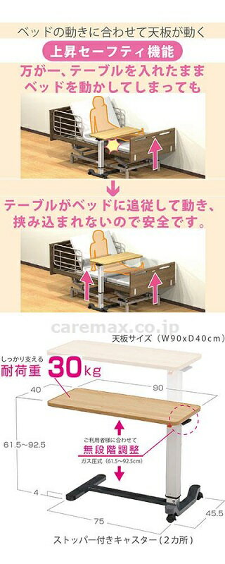 商品の仕様 ●サイズ/幅91×奥行45.5×高さ61.5~92.5cm ●重さ/13.5kg ●材質/天板面:メラミン貼り化粧繊維版、天板縁:PVC、天板裏・脚:スチール、支柱:アルミ ●耐荷重/20kg ●生産国/中国 商品の説明 ・電動ベッドとのはさみ込みを予防する「上昇セーフティ機能」搭載のサイドテーブル。 ・ベッド下が高さ4.5cmまでの電動ベッドに対応できます。 ※個人宅直送時の日時指定は一切不可
