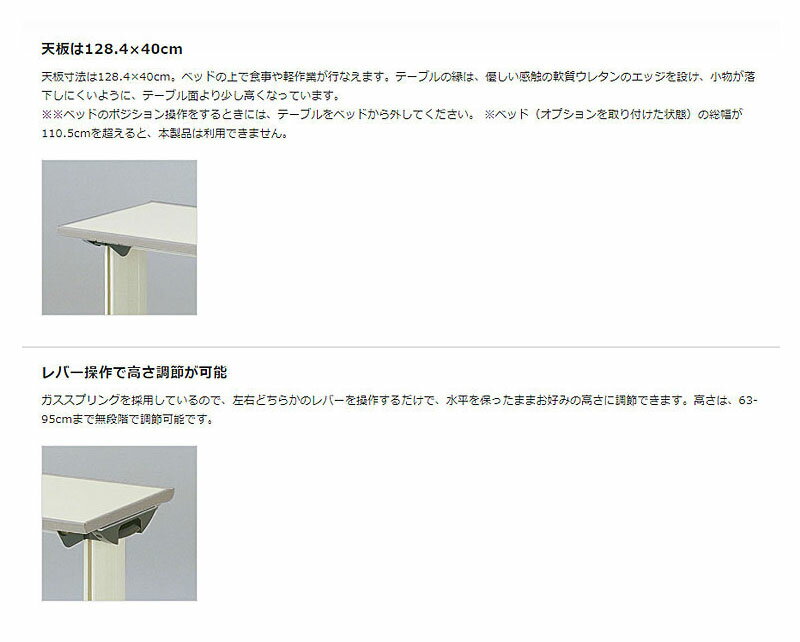 【配送に関してのお願い】 日曜・祝日の配送指定はできません。 配送希望時間の指定は、できません。 【ご注意ください】 個人様宅配送限定商品となります。個人様宅・個人利用以外の場合はキャンセルとさせていただきます。 ※組立をご希望のお客様は、別途組立費がかかります。 ご希望のお客様は、ご注文前にお問い合わせ下さいませ。 ※楽匠Sシリーズと使用する場合には、ハイトスペーサーが必要です。 ※組み立てが必要となります。 ※ベッドのポジション操作をするときには、テーブルをベッドから外してください。 ※ベッド(オプションを取り付けた状態)の総幅が110.5cmを超えると、本製品は利用できません。 ・テーブルの左右どちらからでも簡単なレバー操作で高さを合わせられるテーブルです。 ・ベッドの上で食事や軽作業が行なえます。テーブルの縁は、優しい感触の軟質ウレタンのエッジを設け、小物が落下しにくいように、テーブル面より少し高くなっています。 ・ガススプリングを採用しているので、左右どちらかのレバーを操作するだけで、水平を保ったままお好みの高さに調節できます。高さは、63〜95cmまで無段階で調節可能です。 ・脚部には移動用のキャスターを設けています。 ・本体の左右両側にタオル掛けを設けています。使用しないときには本体に格納できます。 ●サイズ/幅133.4×奥行43.2×高さ63〜95cm ●支柱内寸法/112.5cm(91・100cm幅用) ●天板/幅128.4×奥行40cm ●カラー/アイボリー ●材質/天板:樹脂化粧板、ウレタンエッジー体成形 ●品番/KF-832LA ●メーカー/パラマウントベッド