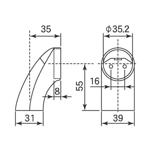 φ35手すり用 壁からの出幅55mm ●手すり金具 ●スマートなデザイン。取付ビス頭が隠せる樹脂カバー付きでスッキリ仕上がります。 ●UB35E-G エンドブラケット (袋入)をDCMでは販売しております。その他の生活雑貨・介護用品も多数取扱っております。 ●材質:本体(亜鉛ダイカスト)、カバー(PP樹脂)。 ●仕上:塗装。 ●サイズ(ミリ):手すり径φ35、出幅:55。 ●カラー:ゴールド。 ●取付ネジ付属 壁面固定用:Aナベ+タッピング4×40(3本)、丸棒固定用:A丸皿+タッピング3.5×20(2本)。