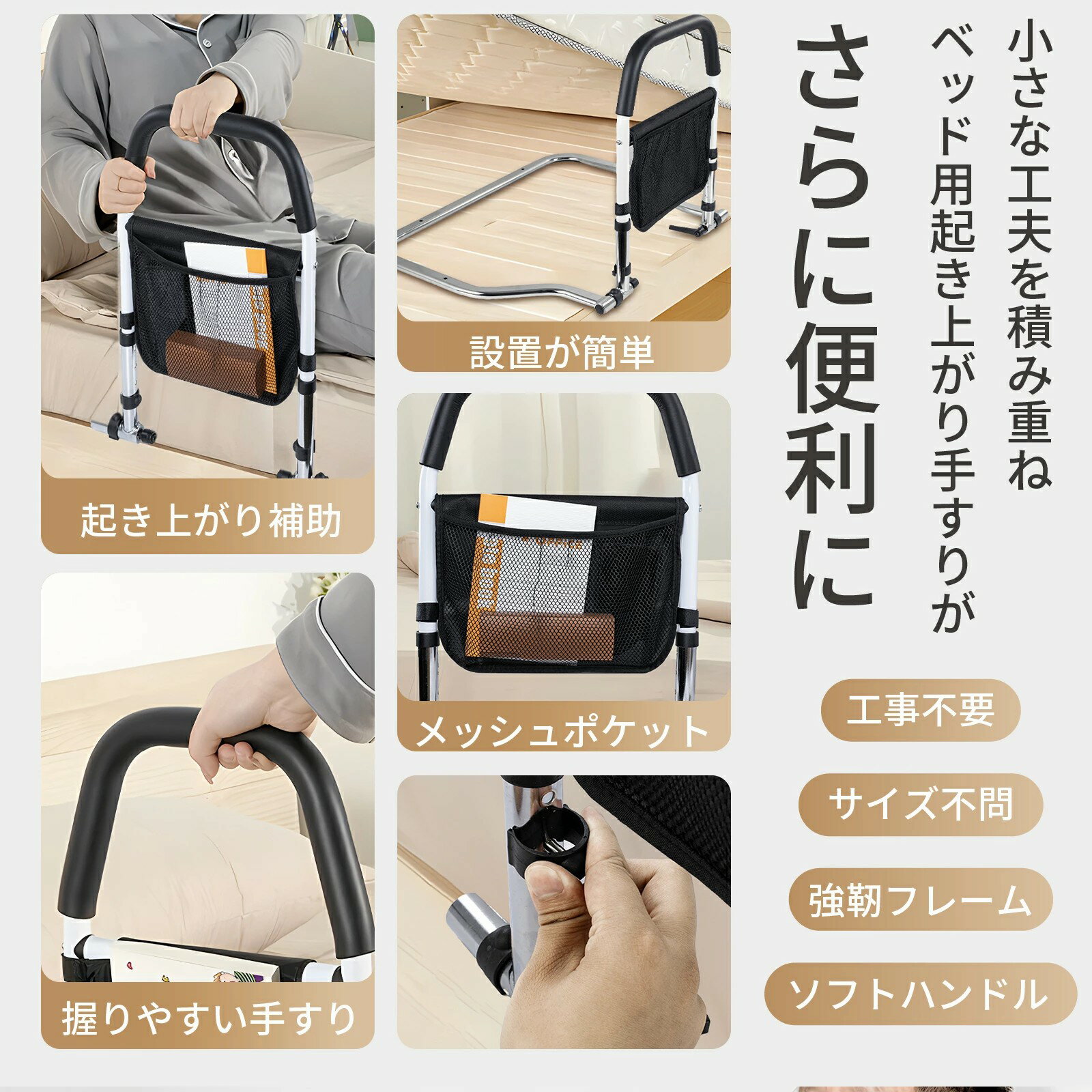 商品名 : ベッド用手すり ベッドガード 折り畳み収納 小物整理バッグ付 ベッドサイド手すり 高さ調整 高強度 4段階 転落防止 起き上がり 補助手すり コンパクト 大人 高齢者向け 荷重力150kg 敬老の日