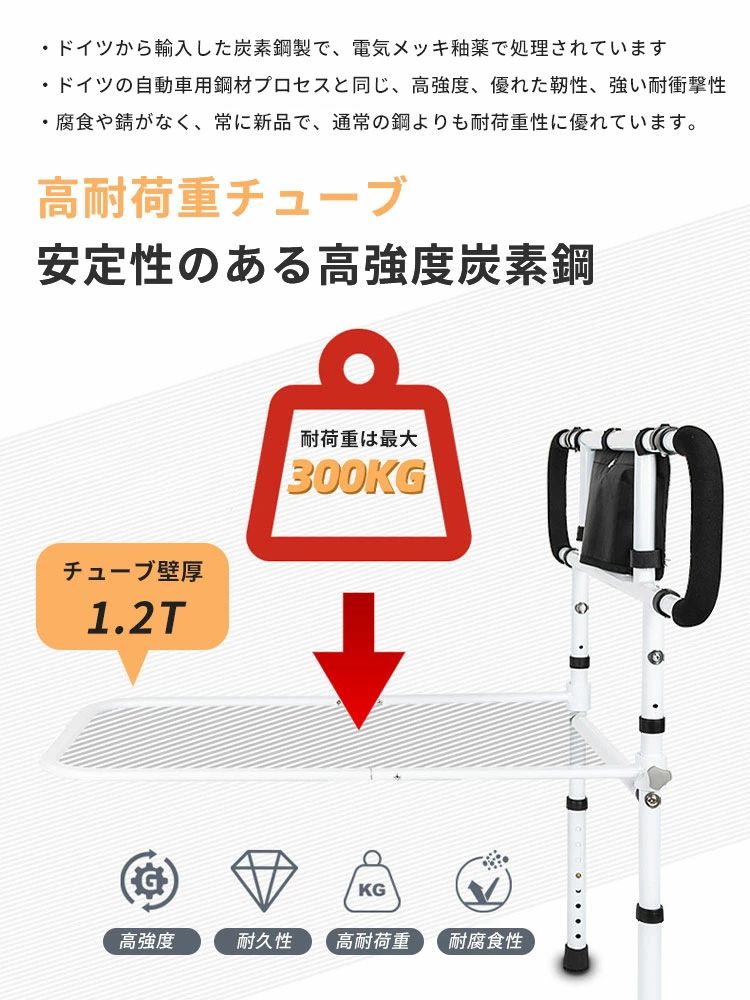 【商品名】:介護用手すり サイズ:幅73-103cm*73cm*高さ75-94cm 素材:炭素鋼 耐荷重:300kg ベッドサイドで徹底サポート 起き上がり、立ち上がり 使い方様々!ベッド用手すり 起き上がり手すり 立ち座り手すり ベッドガードとしても 【商品画像について】 ご覧頂く際の環境やお使いのパソコン環境、及びiPhoneやスマートフォンの動作環境などにより、商品画像の色味 が実際の商品と若干異なって見える場合がございます。 【ご注意事項】 画面保護フィルムの形状により本製品と併用できない場合がございます。 材質の特性上、折り曲げたり強い衝撃を与えますと破損する恐れがございます。着脱の際などお取扱いにご注意ください。 本製品ご使用における人体・スマートフォン本体を含む持ち物・データなどの損傷、破損に対し、弊社は一切の責任を負いかねます。 細部のデザイン等が予告なく変更になる場合がございます。 予めご了承お願い申し上げます。