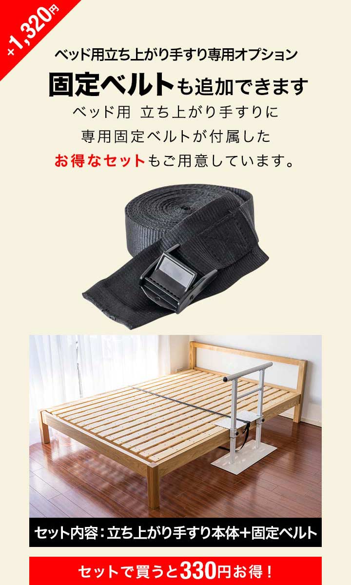 ※[店舗管理用 URL]a09238※[品番]【手すり本体のみ:a09238】【本体+固定ベルトセット(+1,320円):a04170】 ベッドの乗り降りをサポート 高齢者や体が不自由な方のベッドの乗り降りをサポートするベッド用立ち上がり手すり。ベッドから起き上がる際や、立ち上がる際に体を支えやすくする製品です。 普通のベッドに後付けできる ご使用中のベッドに後付けできるので介護ベッドに買い替える手間や費用が抑えられます。プレートの高さ調節可能で、取り付けも簡単です。 安定感のある床置き型 こちらの手すりは接地面積が広く安定感のある床置き型です。体重を掛ける際もぐらつかず安心です。 選べる専用固定ベルトセットも ベットと手すり本体を固定する専用固定ベルトが付属したお得なセットもご用意しています。 ご注意 下記のベッドでは本製品を取り付けることができません。 ・取付箇所がMDF(繊維板)や合板などの強度が弱いもの ・電動リクライニングベッド ・金属製のベッド ・ベッド床板の高さが設置床面から51cmを超え、8cmを・下回るもの [こんな商品をお探しの方に] 手すり 手摺り ベッド用手すり ベッド用品 転倒防止 ケガ防止 歩行支援 歩行補助 寝たきり防止 取って 取手 持ち手 つかまり立ち 立ち上がる 立ち上がり 補助手すり 玄関 階段 和室 寝室 ベッドサイド 布団 ソファ イス 椅子 チェアー 立ち上がり手すり 布団 居間 和室 スタンド アーム ステッキ 杖 老人ホーム 介護施設 福祉施設 保育施設 介護用 業務用 デイサービス 病院 リハビリ支援 リハビリ補助 介護 介助 介護用品 福祉 リハビリ 補助 補助器具 サポート 安全 おしゃれ おすすめ 人気 高齢者 お年寄り シルバー シルバー用品 敬老の日 父の日 母の日 医薬品・コンタクト・介護 介護用品 移動・歩行支援用品 手すり商品詳細(ベッド用 立ち上がり手すり) カラー: ホワイト サイズ: (約)幅64cm×奥行25cm×高さ72.5cm 材質: スチール 重量: (約)8.6kg 最大使用者体重: 100kg 付属品: プレート固定用ネジ(木ネジM4×20mm)×10 特記事項: ※こちらの商品はお客様組み立てとなります。(工具は付属しております) ※下記のベッドでは本製品を取り付けることができません。 ・取り付け箇所がMDF(繊維板)や合板などの強度が弱いもの ・電動リクライニングベッド ・金属製のベッド ・ベッド床板またはサイドフレームの高さが設置床面から51cmを超え、8cmを下回るもの ※底面のクッションにシリコンを利用してる為、材質の特性上、接触・摩擦による床材へ色移りすることがありますので、ご注意ください。 商品詳細(固定ベルト) サイズ: (約)2.5cm×350cm (対応ベッドサイズ目安:シングル〜ダブル) 材質: ポリエステル 重量: (約)100g MADE IN CHINA ※商品は、モニターによって色合いが異なって見える場合があります。 また、仕様・デザインは改良のため予告なく変更することがあります。 ベッドの乗り降りをサポート 高齢者や体が不自由な方のベッドの乗り降りをサポートするベッド用立ち上がり手すり。ベッドから起き上がる際や、立ち上がる際に体を支えやすくする製品です。 普通のベッドに後付けできる ご使用中のベッドに後付けできるので介護ベッドに買い替える手間や費用が抑えられます。プレートの高さ調節可能で、取り付けも簡単です。 安定感のある床置き型 こちらの手すりは接地面積が広く安定感のある床置き型です。体重を掛ける際もぐらつかず安心です。 選べる専用固定ベルトセットも ベットと手すり本体を固定する専用固定ベルトが付属したお得なセットもご用意しています。 ご注意 下記のベッドでは本製品を取り付けることができません。 ・取付箇所がMDF(繊維板)や合板などの強度が弱いもの ・電動リクライニングベッド ・金属製のベッド ・ベッド床板の高さが設置床面から51cmを超え、8cmを・下回るもの [こんな商品をお探しの方に] 手すり 手摺り ベッド用手すり ベッド用品 転倒防止 ケガ防止 歩行支援 歩行補助 寝たきり防止 取って 取手 持ち手 つかまり立ち 立ち上がる 立ち上がり 補助手すり 玄関 階段 和室 寝室 ベッドサイド 布団 ソファ イス 椅子 チェアー 立ち上がり手すり 布団 居間 和室 スタンド アーム ステッキ 杖 老人ホーム 介護施設 福祉施設 保育施設 介護用 業務用 デイサービス 病院 リハビリ支援 リハビリ補助 介護 介助 介護用品 福祉 リハビリ 補助 補助器具 サポート 安全 おしゃれ おすすめ 人気 高齢者 お年寄り シルバー シルバー用品 敬老の日 父の日 母の日 医薬品・コンタクト・介護 介護用品 移動・歩行支援用品 手すり