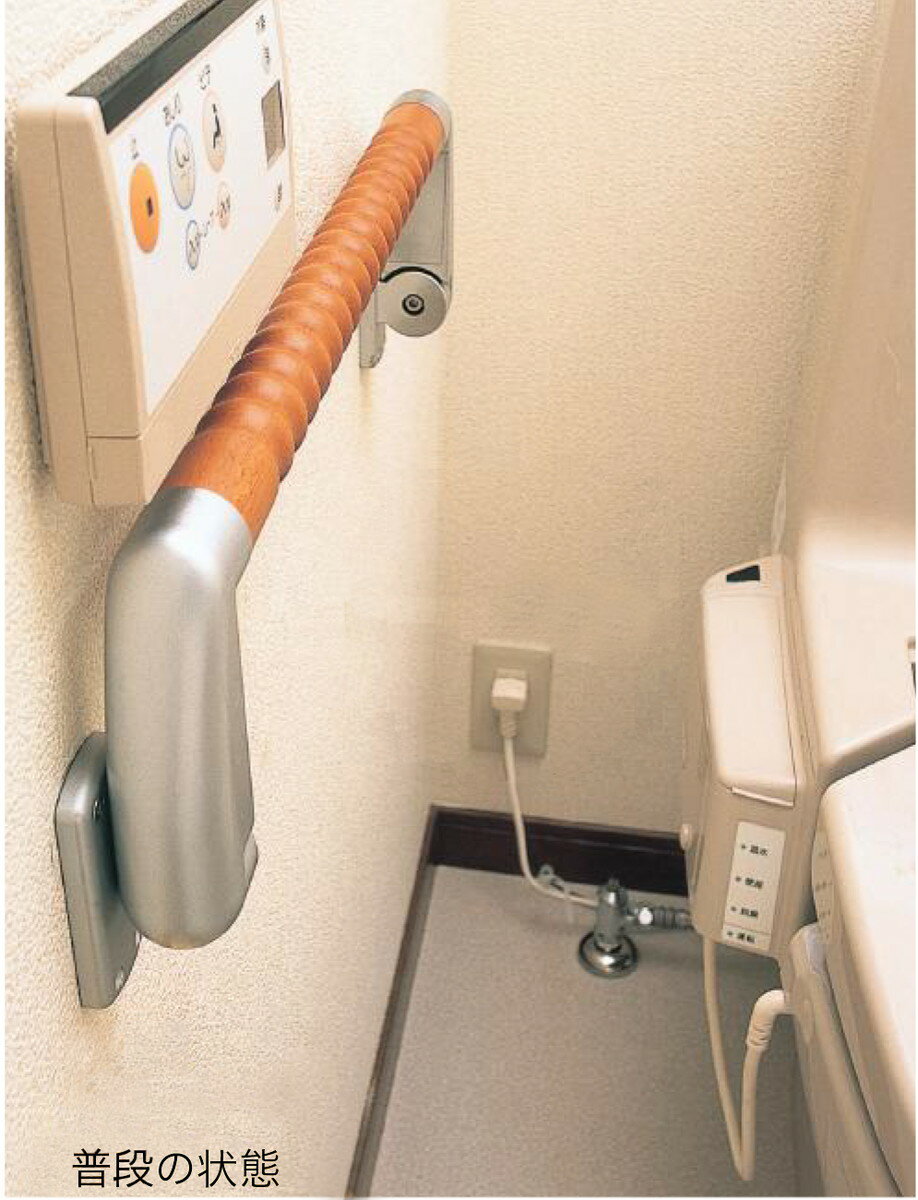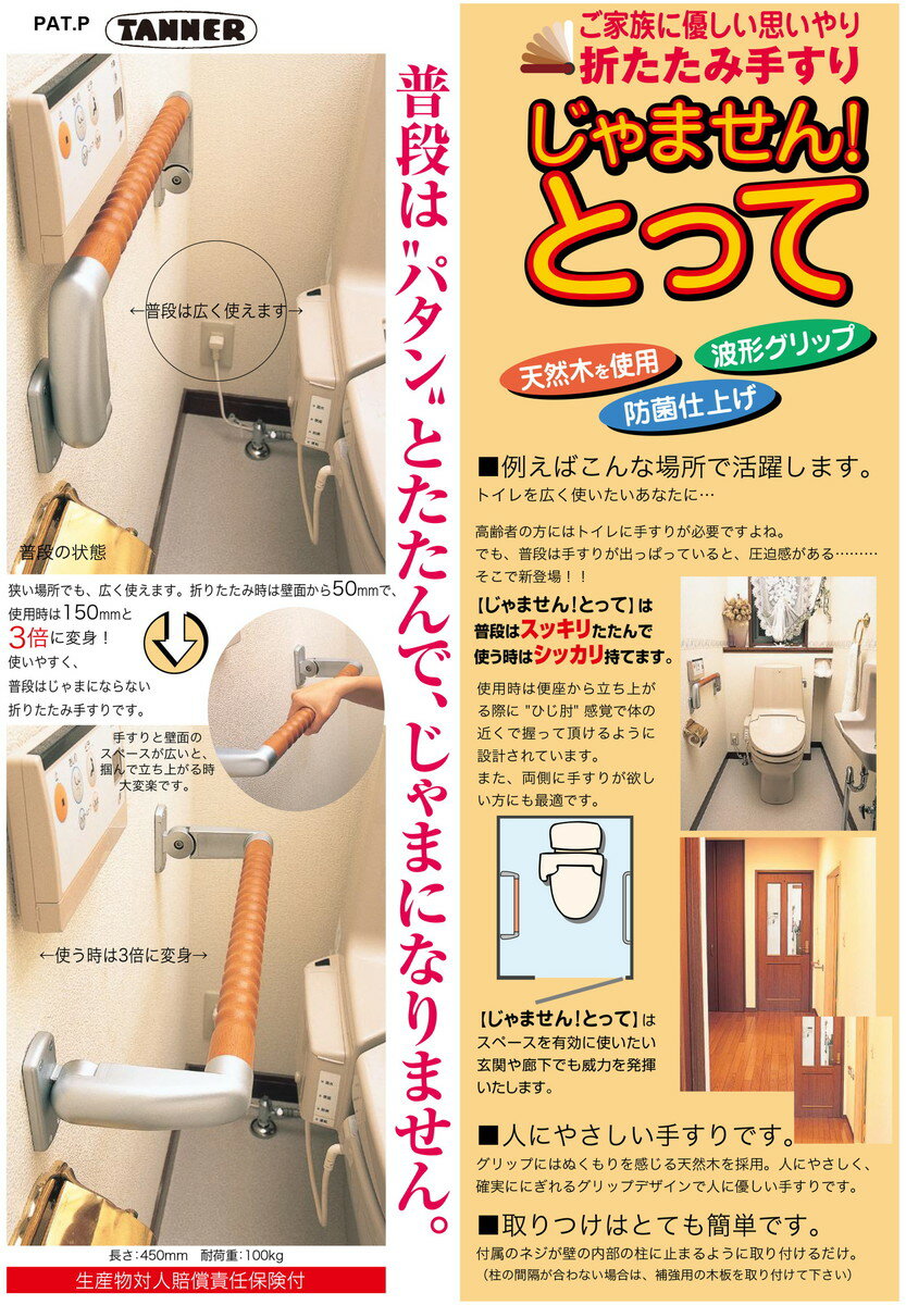 【じゃませんとって】は普段はスッキリたたんで、使うときはシッカリ持てます。高齢者の介護用品にもご利用いただけます。使用時は便座から立ち上がる際に”ひじ肘”感覚で体の近くで握っていただけるように設計されています。また、両側に手すりが欲しい方にも最適です。●折りたたみ時は壁面から50mmで、使用時は150mmと3倍に変身!●グリップにはぬくもりを感じる天然木を採用。人にやさしく、確実ににぎれるグリップデザインです。●付属のねじが壁の内部の柱に止まるように取り付けるだけ。(柱の間隔が合わない場合は、補強用の木板を取り付けて下さい)