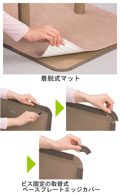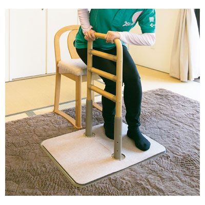 【商品説明】 ・段差の小さいベースプレート(フラットでつまずきにくい構造)。 ・丸洗いできる着脱式マットでいつも清潔に! ・ビス固定の取替式ベースプレートエッジカバー(接着剤未使用で、着脱が容易)。 ・重たいべースプレートを裏返したりせずに、表面より支柱を取り付けることができます。 ・なめらかでシンプルなジョイント。 【仕 様】 ●サイズ/ベース部:幅50.5×長さ60.5cm、手すり部:幅30×高さ70~80(3段階/5cm)cm ●重さ/13.5kg ●材質/マット(表):ポリエステル生地、(裏):アクリル樹脂特殊加工、(手すり部)ジョイント:樹脂、フレーム:樹脂被膜、(ベースプレート)本体:ステンレス、エッジカバー:樹脂、支柱:ステンレス ●最大使用者体重/100kg ●生産国/日本