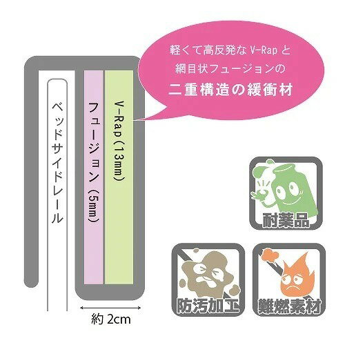 """・内側に加え上部と外側にもクッション入りで更に安心(耐薬品性の表地を使用)。 ・ベッドサイドレールから腕や脚がはみ出るのを防ぐ緩衝材入りカバー。 ・両面と上部にもクッション材が入っており、腕を柵に叩きつけるなどの自傷行為からも守ることができます。 ・柵の内側での事故だけでなく、外側で転んで柵にぶつかってしまうなどの事故からも身体を守ることができます。 ・防汚や難燃・耐薬品素材で、アルコールや次亜塩素酸での拭き取りができ、感染対策の観点からも衛生的にご使用いただけます。 ・3ヶ所のボタンで簡単に着脱が可能です。 ※取付可能なサイドレールについては、内寸をご参照ください。 ●サイズ/M:幅92×高さ43cm(内寸)M:幅85×高さ40×厚さ約5cm×厚さ約5cm ●材質/表地:ポリ塩化ビニール100%、中材:ナイロン74%・ポリエステル26% ●生産国/日本 ●防汚加工、難燃加工"" "