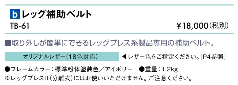 製品の仕様 フレームカラー 標準粉体塗装色/アイボリー 配送について 大型商品(大型宅配便)について お届けは玄関の前まで、ビルやマンションの場合は共同玄関口までの配達となります。配達員は1名でお伺いをいたしますので、トラックからの荷下ろし、 搬入が困難な場合、お客様にお手伝いをお願いしております。 再配達について 路線便での配送となるため、不在時の持ち帰りや再配達の際に別途費用が発生します。ご不明な点はお問い合わせください。 搬入・設置組立について 時間指定や階段を利用しての搬入、設置組立をご希望の場合も別途費用が発生します。必要な場合は予めご相談ください。 個人宅への配送について ご注文時の備考欄に(施設名・屋号・予定名称)をご記入ください。お届け先が個人様宛の場合、別途送料が必要です。 北海道・沖縄・離島へのお届けについて 追加送料が発生します。法人様につきましても追加送料分のご負担が必要です。 サポート情報 ※メーカー希望小売価格はメーカーカタログに基づいて掲載しています。TB-61 レッグ補助ベルト 取り外しが簡単にできるレッグプレス系製品専用の補助ベルト。※レッグプレスII(分離式)にはお使いいただけません。ご注意ください。 レザーカラーは18色のオリジナルレザーからお選びいただけます。 メディカル専用に開発された5つの特性を持つ高耐久ビニルレザーです。 高田ベッド製作所正規特約店のエンバシーで安心をプラス! ご注文はこちらから