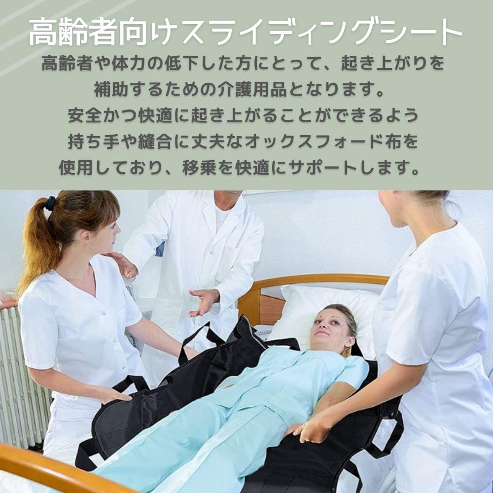 " 商品情報 サイズ 幅約100cm x 長さ約120cm 素材 オックスフォード布、ポリエステル 特徴 【高齢者向けスライディングシート】高齢者や体力の低下した方にとって、起き上がりを補助するための便利な介護用品となります。安全かつ快適に起き上がることができるよう持ち手や縫合には丈夫なオックスフォード布を使用しており、移乗をサポートします。 【高品質の素材】持ち手と縫合は耐久性のあるオックスフォード素材を使用しているため、長期間にわたって安心してご利用いただけます。シート地はポリエステル製で耐摩耗性が高く、防水性と通気性に優れています。お手入れも簡単で、乾きやすく、繰り返しの利用にも最適です。 【8つの持ち手】8つのハンドルがシートの四方に均等に配置され、最適な位置で握れるような快適さを実現。ハンドルは滑りにくい素材で作られており、しっかりとしたグリップを提供します。 【洗濯可◎衛生的】シートは洗濯機で洗える素材で作られているため、常に清潔に保つことができます。洗い終わったら、自然乾燥で繰り返し使えるので衛生的。使用者の快適さと衛生面を考慮した設計となっています。 【荷重】約100 kg 【適用対象】高齢者、肥満患者、障害者、家庭看護、リハビリをされている方など。寝たきり・車いす・車シートなど、様々な場面での使用に適しています。 注意事項 ※モニター環境等によって色の見え方に若干差が生じる場合がございます。 ※サイズ数字は目安です。商品により若干の誤差がございます。 キーワード スライドシート 患者 介護 高齢者 起き上がり 補助 担架 ベッド 車 車いす 介護 介助ベルト シート シーツ 寝返り 介護用品 グッズ 持ち運び【送料無料】PLEAVIT スライディングシート 移乗シート 簡易担架 介護用品 介護 起き上がり補助 移動 シート (黒) 移乗用具 体位変換 移乗用シート 床ずれ 介護用品 移乗 介助 介助者 負担 軽減 施設 ベッド ベッド介助 ベッド移動 スライディング シート 移乗シート 高齢者 寝たきり 在宅介護 サポート シート 介助シート 移乗ボード 水平移動 移乗 介助 簡単 らくらく 【便利な高齢者向けスライディングシート】 この便利な高齢者向けスライディングシートは、起き上がりを補助するために設計された120cmx100cmの移乗シートです。8つのハンドルがついており、安全かつ簡単に移乗をサポートします。滑り止め素材や耐久性のある素材の使用、洗濯可能な仕様など、多くの特徴を備えています。高齢者の方や体力の低下した方にとって、日常生活の中で大いに役立つアイテムです。 【特徴】 サイズ:このスライディングシートは、120cm x 100cmのサイズで製造されています。ハンドルが付いており、高齢者の起き上がりを補助するために設計されています。 移乗の補助:高齢者や体力の低下した人々がベッドや椅子などから起き上がる際に使用することができます。ハンドルをつかんで引っ張ることで、安全かつ簡単に移乗を行うことができます。 8つのハンドル:スライディングシートには、8つのハンドルが均等に配置されており、最適な位置でハンドルをつかむことができます。ハンドルはしっかりとしたグリップがあり、滑りにくい素材で作られています。 耐久性と安全性:スライディングシートは、丈夫で耐久性のあるオックスソード素材などで作られています。また、製品は厳格な品質管理基準に従って製造されており、安全性が確保されています。 使いやすさ:スライディングシートは、簡単に使用できるように設計されています。ハンドルをつかんで引っ張るだけで、移乗をスムーズに行うことができます。 収納や携帯に便利:スライディングシートは、折りたたむことができるため、収納や携帯に便利です。必要な場所に持ち運んで使用することができます。 清潔な使用:スライディングシートは、洗濯機で洗うことができる素材で作られています。定期的に洗濯することで清潔さを保つことができます。