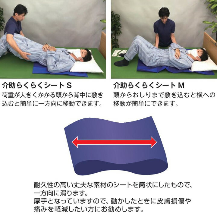 摩擦が少なく耐久性の高い丈夫な素材のスライディングシートです。筒状になっていて、一方向に滑ります。厚手となっていますので、動かしたときの痛みなどを軽減したい方におすすめします。ご利用者の体の下に敷き込んで使用します。ベッド上での移動や体位変換、移乗にとても便利です。少しの力で介助ができ、介助する方と介助を受ける方の負担を軽減します。[Sサイズ]荷重が大きくかかる頭から背中に敷きこむと簡単に一方向に移動できます。[Mサイズ]頭からおしりまで敷きこむと横への移動が簡単にできます。<材質> ナイロン※洗濯は洗濯ネットに入れ、中性洗剤をお使いください。仕様表サイズ[Sサイズ] 幅73×長70cm[Mサイズ] 幅73×長120cm規格1枚