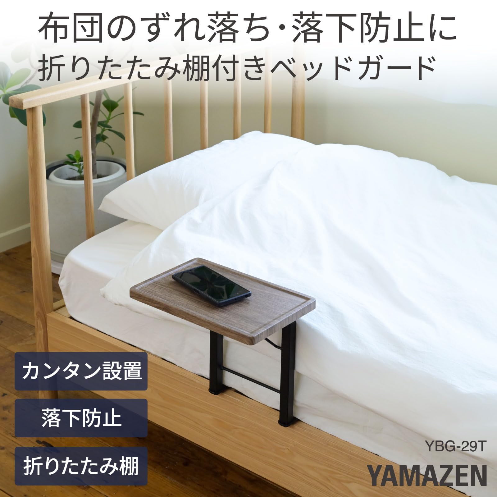 折り畳み棚付き・マットブラック 幅29.5×奥行53×高さ30.5cm YBG-29T(DOK/MBK)・・Color:マットブラックStyle:折り畳み棚付き・落下防止に布団の落下を防止するベッドガードです。布団がずれたり、落下するのを防ぐので快適な睡眠環境をサポートします。・簡単設置ベッドマットレスの下に差し込むだけなのでカンタンに設置できます。マットレスの下に入る部分が薄いので差し込みしやすく、設置した後もマットレスが盛り上がりにくいです。・折りたたみテーブル付きスマホや本をちょい置きできる棚付きです。使わないときは折りたためるので邪魔になりません。・※必ずベッドマットレスの下に差し込んでご使用ください。・●本体サイズ(約) : 幅29.5×奥行53×高さ30.5cm●構造部材:フレーム/金属(スチール)、棚板/合成樹脂化粧繊維板(塩化ビニル樹脂)●表面加工 : フレーム/エポキシ樹脂塗装●東証プライム(株)山善で扱うすべての山善商品は、自社もしくは第三者機関において、JIS規格に基づいた試験を行っております。説明 山善「ベッドガード YBG-29T」 落下防止に布団の落下を防止するベッドガードです。布団がずれたり、落下するのを防ぐので快適な睡眠環境をサポートします。 簡単設置ベッドマットレスの下に差し込むだけなのでカンタンに設置できます。マットレスの下に入る部分が薄いので差し込みしやすく、設置した後もマットレスが盛り上がりにくいです。 折りたたみテーブル付きスマホや本をちょい置きできる棚付きです。使わないときは折りたためるので邪魔になりません。 ※必ずベッドマットレスの下に差し込んでご使用ください。 ●本体サイズ(約) : 幅29.5×奥行53×高さ30.5cm ●構造部材:フレーム/金属(スチール)、棚板/合成樹脂化粧繊維板(塩化ビニル樹脂) ●表面加工 : フレーム/エポキシ樹脂塗装 ●東証プライム(株)山善で扱うすべての商品は、国内の第三者機関において、JIS基準に基づいた試験に合格しております