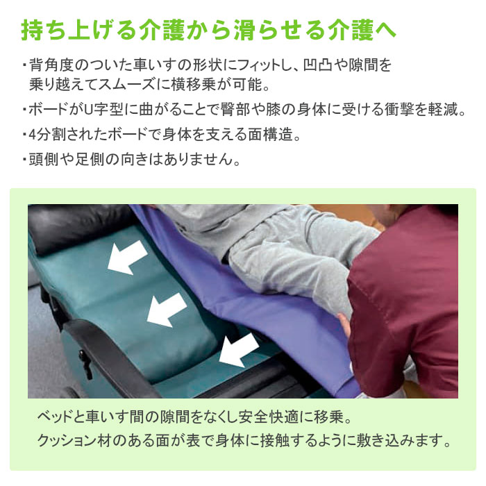 ※メーカー直送商品となります。 本体がU字型に曲がって体にフィットするので、寝た姿勢のままベッドとティルトリクライニング車いす間の移乗がスムーズに行えます。 無理に持ち上げ移乗することで引き起こされる、ご利用者の筋緊張やスキントラブル、介護する方の腰痛を予防することができます。 サイズ:幅50×長さ140cm 重量:約2.25kg 材質: シート・マット:ポリエステル100% 芯材(エルク):複合繊維(ポリエステル)100% ボード:ポリプロピレン100% 付属品:収納袋(ボードを二つ折りにして収納) メーカー:ウェルファン