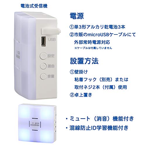 光フラッシュ受信機(単3形×3本)白/チャイム増設用/OCH-DC47-BLUE・Size:チャイム増設用Style:光フラッシュ受信機(単3形×3本)・パッケージ個数:1・monban CUBEシリーズ増設用・音と光フラッシュでお知らせします・電池式(単3形アルカリ乾電池×3本/別売)・送信場所お知らせランプ、ミュート機能・動作距離:約100m(直線見通し・遮蔽物の無い環境)