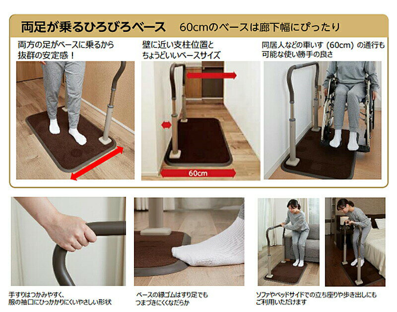 ・長い手すりが廊下でのつたい歩きやベッドサイドでの立ち上がりをサポート。 ・両足が乗るひろびろベース。 廊下にぴったりな幅60cmのベース。 支柱位置も壁寄りですっきり。 ・手すり高さはマックス85cm。 少し高い位置で持ちたい方にもオススメ。 ●サイズ/ ベース部:幅60×長さ90×厚さ1.1cm 手すり部:幅81×高さ70〜85(7段階)cm 手すり径:φ3.5cm ●重さ/22kg ●材質/ ベース・支柱:スチール 手すり:塩化ビニル樹脂(被膜部)・アルミニウム(芯材・ジョイント) ベース縁ゴム:塩化ビニル樹脂 カーペット:合成繊維 支柱カバー:エラストマー ●最大使用者体重/100kg ●生産国/日本 ●TAISコード/00980-000363 ●メーカー品番/XPN-L80801 ●メーカー名/パナソニック エイジフリー