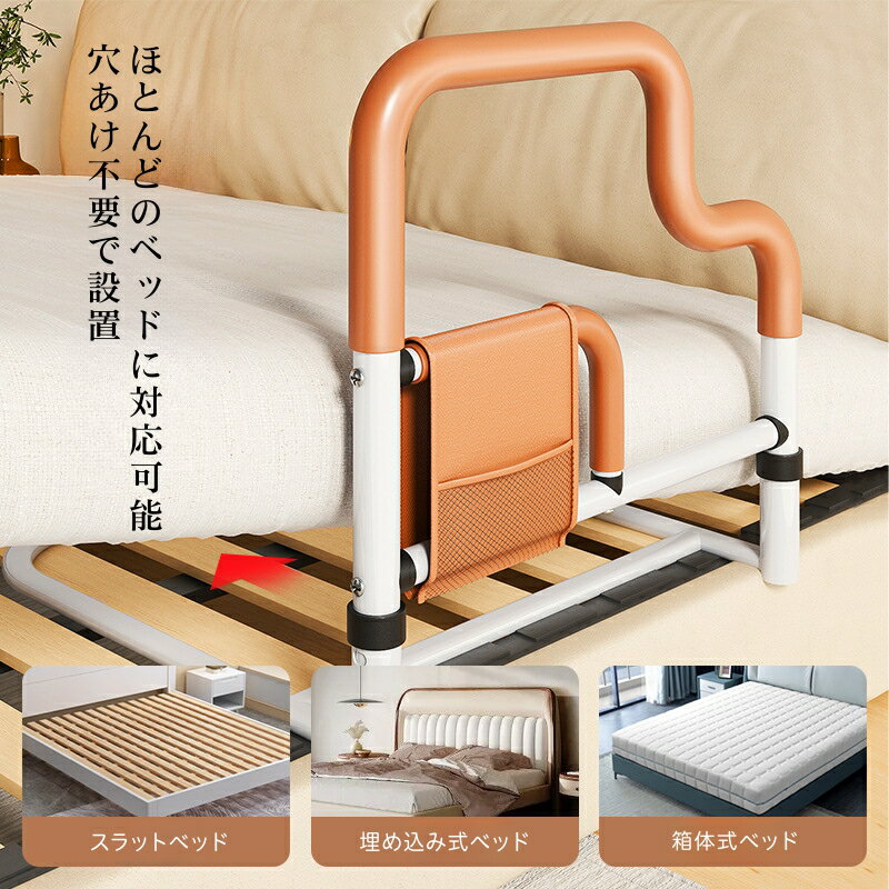 【耐荷重は100KG】 妊婦、高齢者、障害者と術後患者のために設計されて、膝や腰の負担にならないように起上がりを補助する手すりです。 ベッドからの転落防止や布団のズレ落ち防止にも役立ちます。 小物が収納できるポケットが付きます。 台座は楕円のパイプを採用しており、厚さはわずか1.3cmで、どんなタイプのマットレスにも取り付けることができます。 手すりの部分は滑り止めEVA素材で、滑り止め効果がありながら、冬でも冷たさを感じにくく。 【使用方法】:ただマットレスの下に挟んむだけでは不安な方に、ベッドの床板にはネジ止めで固定できます。