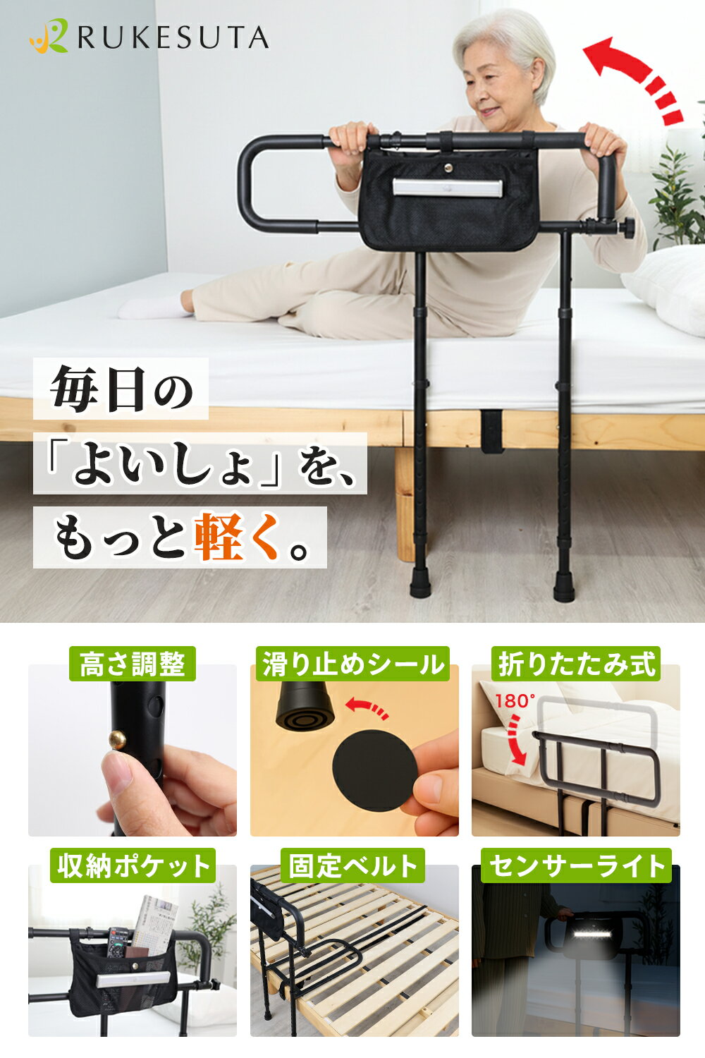 関連ワード [介護の専門家監修] ベッド 手すり ライト付き ベッドガード ベッド補助 ベット 介護 手すり 起き上がり 補助 立ち上がり 補助 ベッド 介護 補助手すり ベルト付き バッグ付き シニア サポート 柵 高齢 介助 介護 起き上がり 楽々 RUKESUTA 新製品 おすすめ ギフトアイテム多数ご用意しております 誕生日 父の日ギフト 父の日 プレゼント 母の日ギフト 母の日 プレゼント 実用的 母の日ギフト 花以外 母の日 花以外 敬老の日 記念品 クリスマスプレゼント バレンタインギフト ホワイトデーギフト 内祝 内祝い お祝い返し ウェディングギフト ブライダルギフト 引き出物 引出物 結婚引き出物 結婚引出物 結婚内祝い 出産内祝い 命名内祝い 入園内祝い 入学内祝い 卒園内祝い 卒業内祝い 就職内祝い 新築内祝い 引越し内祝い 快気内祝い 開店内祝い 二次会 披露宴 お祝い 御祝 結婚式 結婚祝い 出産祝い 初節句 七五三 入園祝い 入学祝い 卒園祝い 卒業祝い 成人式 就職祝い 昇進祝い 新築祝い 上棟祝い 引っ越し祝い 引越し祝い 開店祝い 退職祝い 快気祝い 全快祝い 初老祝い 還暦祝い 古稀祝い 喜寿祝い 傘寿祝い 米寿祝い 卒寿祝い 白寿祝い 長寿祝い 金婚式 銀婚式 ダイヤモンド婚式 結婚記念日 ギフト ギフトセット セット 詰め合わせ 贈答品 お返し お礼 御礼 ごあいさつ ご挨拶 御挨拶 プレゼント お見舞い お見舞御礼 お餞別 引越し 引越しご挨拶 記念日 卒業記念品 定年退職記念品 ゴルフコンペ コンペ景品 景品 賞品 粗品 お中元 御中元 お歳暮 御歳暮 お年賀 御年賀 残暑見舞い 年始挨拶 ブラックフライデー 2025ベッドガード 立ち上がり補助 ライト付き 暗いときだけ光る、自動ライト付きベッド手すり。 夜間の転倒予防から、起き上がり・立ち上がり・移乗まで、毎日の動作をしっかりサポートします。 ● 4つのシーンをしっかりサポート ・転落防止:寝返りしても落ちにくいベッドガードとして ・起き上がり:横→座の動作をやさしく補助 ・立ち上がり:握るだけで安定して立てる構造 ・移乗介助:180°折りたたみで車いすなどの移乗をサポート ● 夜間の転倒予防(自動センサーライト) ・暗い場所で人を感知すると自動で点灯 ・一定時間で自動消灯、明るい時は光らない省エネ設計 ・夜中の移動時に足元をやさしく照らします ● 細かく合わせられる高さ調整 ・手すり高さ5段階+脚部16段階+幅3段階 ・その人に“ちょうどいい高さ”に調整できます ・無理のない姿勢でつかまりやすく、動作が安定 ● 耐荷重136kgの丈夫なスチールフレーム ・揺れにくく、体を預けても安定 ・毎日の使用でも歪みにくい強度 ● 工具不要のかんたん設置 ・マットレス下に差し込むだけ ・付属の固定ベルトでしっかり固定 ・すのこ/板張り/フラットなど、多くのベッドに対応 ● 滑り止めシールでガタつき防止 ・床との接地が安定し、わずかな高さ調整にも便利 ● やさしい握り心地のPUクッション ・手にフィットして握りやすく、冬でも冷たくない ● 洗えるメッシュポケット付き ・スマホや眼鏡など枕元の小物をすっきり収納 ブランド RUKESUTA 説明書 bedrisehandle002_取扱説明書 ↑PDFファイルがダウンロードされます 素材 スチール+PU サイズ 全体高さ:82〜111cm 手すり幅(3段階):56〜76cm 手すり高さ(5段階):47〜57cm 脚部高さ(16段階):34〜53cm 重量:3.1kg 仕様 縦にも横にも伸縮可 180度折りたたみ可でベッドへのアクセスが楽 夜間に安心なライト付き 長さ調整可能 耐荷重:136kg 組み立て式 商品内容 ベッドガード本体(組み立て式)、固定ベルト×1、自動センサーライト×1、滑り止めシール×1 カラー ブラック JANコード 4573616911344 品番 bedrisehandle002 注意 カラーの見え方につきましては、お客様のモニターなどの設定により、違って見える場合がございます。 入荷時期により、商品・パッケージの仕様が変更になる場合がございます。