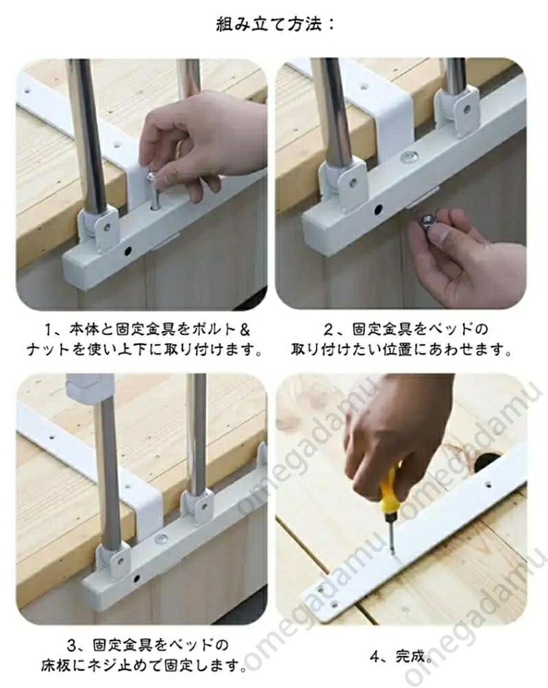 商品情報 ベッドに固定するだけ!折りたたみ可能ベッド用手すり。 妊婦、高齢者、障害者と術後患者のために設計されて、膝や腰の負担にならないように起上がりを補助する手すりです。 ベッドからの転落防止や布団のズレ落ち防止にも役立ちます。 レバーを押しながら倒すと簡単に折りたためます。使わない時は、設置したままスッキリ収納できます。 組立とても簡単で女性一人でも完成させる。 サイズ F サイズについての説明 長70cm 折り畳み長さ100cm 高さ40cm 折り畳み高さ13cm 耐荷重は100KG 素材 フレーム:ステンレス製 手すり:EVA 色 ホワイト ブルー レッド(木目調) ベージュ(木目調)