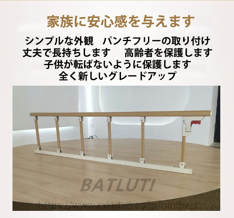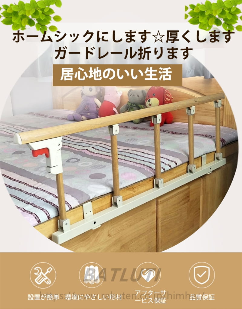 この商品について 素材:アルミ合金、ステンレス、プラスチック セット内容:本体、ベッド取付け用バー、固定金具、  ▼取付け部分は木製のみ レバー操作で簡単に折りたたみができるベッドガード。使わない時は折りたたんでベッド側に収納できて便利です。 布団のずり落ち、高齢者の転落防止用としてはもちろん、ひざ?腰に負担を掛けない立ち上がり補助としてもお使い頂けます。 支柱には頑丈なステンレスを採用しており、優れたサポートと安定性を実現。上下バーは木目調で、ナチュラルさもプラスされ、優しい空間を演出できます。 【3サイズバリエーション選択】 3段 商品サイズ:70cmx40cm  収納サイズ:95cmx13cm 4段 商品サイズ:95cmx40cm  収納サイズ:120cmx13cm 5段 商品サイズ:120cmx40cm  収納サイズ:145cmx13cm ※表記のサイズは目安です。 【折りたためると】 ベッドメイキングも楽々~ お客様組立品(工具必要) 素材:アルミ合金、ステンレス鋼、プラスチック セット内容:本体、ベッド取付け用バー、固定金具、日本語マニュアル 用途:起き上がり介助、布団のずり落ち防止、転落防止 重要: ベッド取付け部分は木製に限ります。 (例:木製ベッド、すのこベッド) 【使用シーン】 転落防止だけでなく、手すりとしてベッドからスムーズに起き上がられます。 ガードはパタンと倒せる折りたたみ式なので、不要なときはベッドに腰掛けることもできます。 ご注意: ベッドガード支柱、ベッドガードとマットレスなどとの隙間に身体の一部が入らないよう注意してください。 腕や首、頭を隙間にはさまれたり、怪我や重大事故の恐れがあります。 当製品による事故やケガについて、弊社では一切の責任を負いかねます。 知識のある方のみのご購入をお願い致します。 生産ロットにより、ビスは若干変更になる場合がございます。あらかじめご了承くださいますようお願い申し上げます。