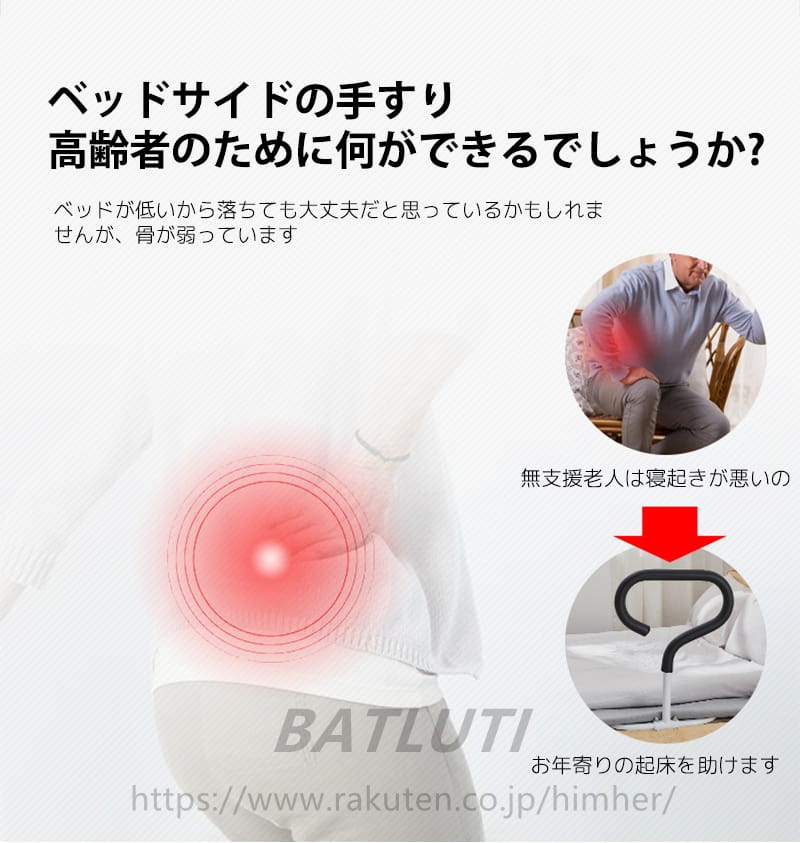 この商品について 【取り付け簡単、使いやすい】このコンパクトなベッドレールはとても手頃なサイズで、手すりは場所を取らず、ベッドの乗り降りの足元を邪魔しないように小さく設計されています を機能性を保ちながら実現しました。 組み立てはとても簡単で、組み立ててマットレスとベッドボードの間に挿入して固定すれば、すぐに使用できます。 【安全のために必須】コンパクトなベッドレールは、ベッドへの乗り降りが困難な方におすすめです!高齢者、人工股関節置換術後の方、腰痛持ちの方、妊娠中の方、障害やその他の怪我をお持ちの方に適しています。 ベッドレールは、個人がベッドから降りるのをより簡単かつ安全にし、転倒や二次災害のリスクを最小限に抑えます。 【とても頑丈】本製品のフレーム素材には高強度合金鋼を使用し、シャーシとベッドの接触面をより安定させるためにベース部分を広くして信頼性を大幅に向上させ、最大115kgの重量に対応していますので、安心してご使用ください。 【夜間のベストヘルパー】移動が困難な方の自立した起き上がりをサポートします。 夜間、トイレに行くために立ち上がる際、ベッドレールにつかまることでベッドから降りることができます。 また、このベッドレールは、高齢者がベッドから降りる際に転んでケガをするのを防ぎ、ベッドから降りようとすると立ち方が不安定になるというジレンマを解消し、さらに夜間に起き上がる際の不安も解消してくれます。 【メッカ保証】本製品は作業理学療法士が高く評価しており、手術から回復した患者や移動に制限のある人々に優れた支援を提供します。 この製品に関するご質問やご意見がございましたら、お気軽にお問い合わせください。 24/7のサービスと30日間の返金保証を提供しています。
