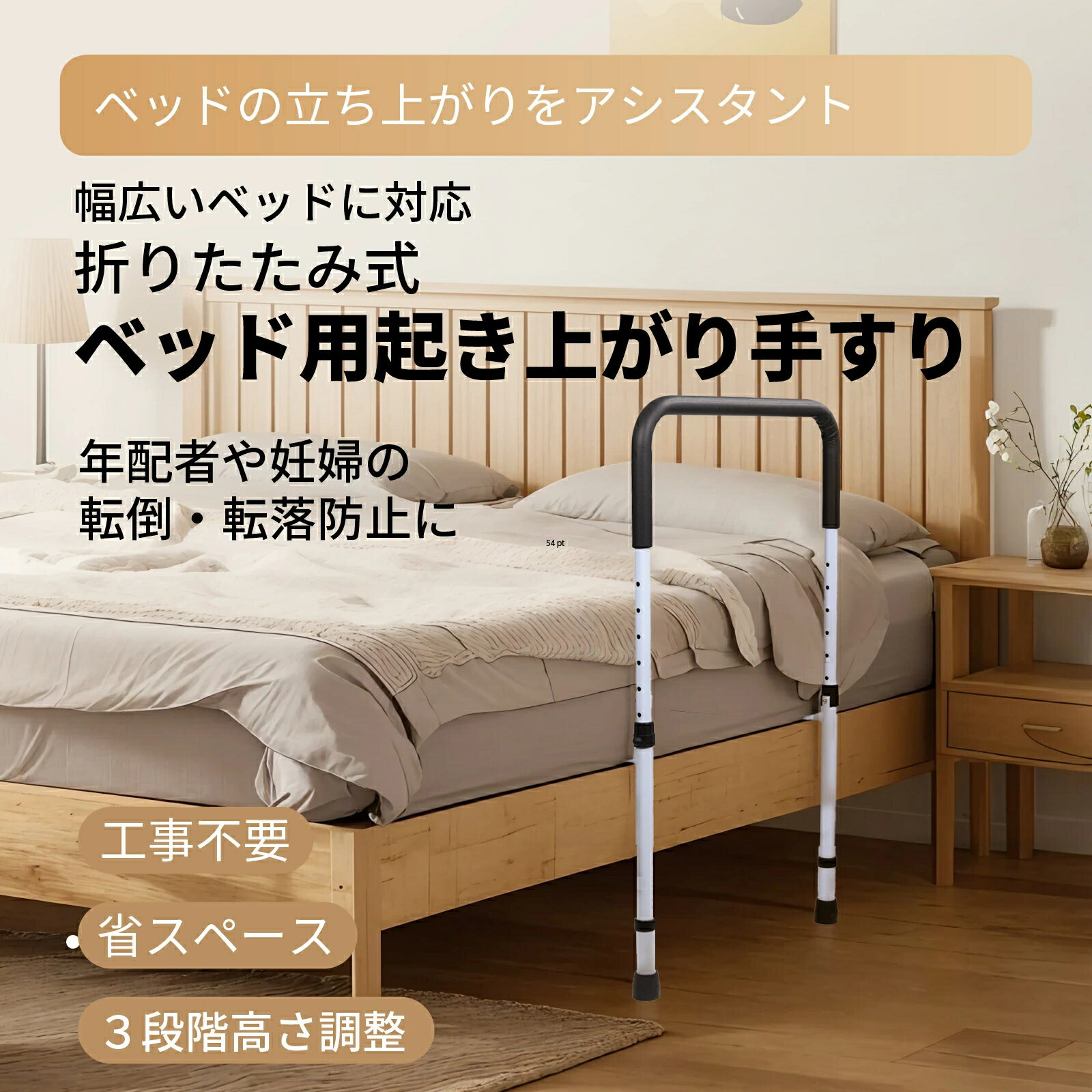 【商品説明】 立ち上がり・就寝を快適・安全に 安心・安全なサポート:設計は使う人の立場から。高齢者、身体障害者、妊娠中の方やケガをしている方など、ベッドからの起き上がりや立ち上がりをスムーズ・安全にサポートします。 工具不要&シンプル設置:高齢者や女性でも簡単にセッティング。置くだけでガタつかず、しっかり固定されます。 カスタマイズ可能: 6高さ調整:55?86cmまでの調整で、最適なサポートを保証。 幅広いベッド対応:折りたたみベッドや様々なベッドタイプにフィット。マットレスを敷くタイプのほとんど全てに適合。 強固なサポート:耐荷重は150kg。安定した支点となる長く広いホルダーが、マットレスと床板の間でしっかり固定。体重を預けても手すりは外れません。 機能性とデザインの両立: 立ち上がりの補助:すべりにくいハンドルで、立ち上がりの際の転倒を予防。 就寝時の安全:サイドガード機能で、寝ている間の転落を防ぐ。 腰掛けサポート:腰をかけたときの背もたれとしても役立つ。 【商品詳細】 手すりの高さ:55-86cm 手すりの幅:51.5cm ホルダーの長さ:85-95cm サイズ:約85-95 × 51.5 × 69-104cm 重量:3.3kg 【配送について】 ★配送料は、購入のお届け先により変動します。商品のお届けは、沖縄などの地域は追加料金がございます。正確な送料については、こちら注文を確認してからご連絡をさせていただきます。 ★複数お買い上げの場合に別々にお送りすることがございます。 【注意事項】 ▼商品は簡易包装でお送り致します。 ▼お使いのモニターによっては、実際の色と若干異なって見える場合があります。 ▼ 製造時期によりデザインや仕様に若干の変更がある場合がございます。ご了承ください。 ▼実寸は素人採寸ですので、多少の誤差はご了承願います。 ▼在庫数の更新は随時行っておりますが、お買い上げいただいた商品が、品切れになってしまうこともございます。 その場合、お客様には必ず連絡をいたしますが、万が一入荷予定がない場合は、キャンセルさせていただく場合もございますことをあらかじめご了承ください。 【120日間保証】 ご使用中においてのお客様の過失による故障、破損、改造等はサポート保証の対象外となります 【返品・交換について】 ◆返品・交換の場合、未使用の商品のみ到着日から7日以内にご連絡頂ければ、対応させて頂きます。万が一お届け商品がご注文内容と異なったり、欠陥、汚損があった場合、交換、もしくは返金させて頂きます。 【関連キーワード】 ベッド手すり 折りたたみ式ベッド手すり ベッド用手すり 介護ベッド手すり サイドレール ベッドサイドレール 転落防止手すり ベッドガード ベッド用ガード ベッド用補助手すり 立ち上がり補助手すり ベッドサポートバー 介護用手すり 介護ベッド用サイドレール 高齢者用ベッド手すり シニア向け手すり お年寄り用手すり 自立支援手すり 在宅介護グッズ ベッド補助グッズ 介護用ベッドアクセサリー 福祉用具 介護用品 寝具補助用品 ベッド補助具 省スペース手すり 折りたたみ収納可能 工具不要 簡単取り付け 組立簡単 持ち運びしやすい スリム収納 軽量ベッド手すり 丈夫で安心 耐荷重あり 安定設計 滑り止めグリップ クッション付きグリップ マットレス下差し込みタイプ フレーム固定式 置き型手すり 据え置き型ベッド手すり 木製ベッド対応 スチール製手すり コンパクト介護手すり 和室洋室対応 シングルベッド対応 セミダブルベッド対応 自宅介護 老人ホーム 施設用 福祉施設用 夜間の転落防止 寝返り補助 立ち座り補助 起き上がりサポート 起床サポート 介護ベッド安全対策 家庭用安全グッズ 敬老の日ギフト プレゼント 高齢者ギフト ギフトにもおすすめ 送料無料 人気 ランキング おすすめ セール 新生活応援