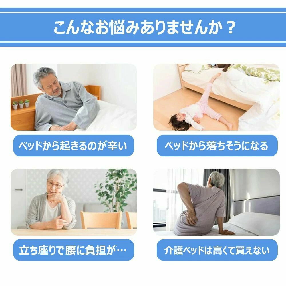 商品名 ベッド補助手すり【工事不要】 サイズ&タイプ 【Mサイズ】炭素鋼タイプ:52*51*33.5cm、重さ2.1kg 【Lサイズ】炭素鋼タイプ:47*52*47cm、重さ2.65kg 【Lサイズ】ステンレスタイプ:47*52*47cm、重さ2.3kg 耐荷重 70kg〜80kg 商品について 【選べる2サイズ!広い支え面でしっかりサポート】 本商品の支え面は小サイズ(33.5×51cm)と大サイズ(47×52cm)の2種類をご用意。用途や設置場所に合わせて選べます。広い受力面が体重をしっかり受け止め、より安定した支えを実現。ベッドの乗り降りや起き上がりをサポートするだけでなく、体のバランス維持にも役立ちます。耐久性にも優れており、日常使用でも安心してご使用いただけます。 【薄型マットレスにも対応!扁平管設計で快適な使用感】 本製品は底部に扁平管を採用しており、体に食い込みにくく、背中への圧迫感を軽減。マットレスの厚さが7cm以上あればご使用いただけるため、薄型マットレスにも対応可能です。一般的なパイプ形状と違い、寝返りや体の動きに干渉せず、自然な寝姿勢をサポートします。快適さと実用性を兼ね備えた設計で、ご高齢の方や身体の不自由な方にも安心してお使いいただけます。 【便利なダブルポケット付きで収納力アップ】 サイドには両面にメッシュポケットを装備しており、本や雑誌、テレビのリモコン、スマートフォンなどの小物を収納可能。ベッドから手を伸ばすだけで必要なものをサッと取り出せるため、より快適なベッドライフを実現します。整理整頓にも便利で、介護現場や病室でも大活躍。使う人の目線で設計された実用性抜群の収納付きベッド用手すりです。 【快適さと二重の安全性を両立】 アームレストには滑り止め付きのフォームパッドカバーが施され、柔らかく心地よい握り心地を提供し、スチールの硬さや乾いた季節の静電気を遮断します。シートベルトがさらなる固定力を加え、アームレストのズレや動きを防ぎ、事故の危険を減らして安全性を高めます。 【ダブル固定構造でしっかり固定&簡単設置】 本製品は差し込み式のロック機構に加え、ネジ穴を備えており、ビスでの固定も可能な二重構造。差し込んでロックノブを締めるだけの簡単操作でしっかり固定でき、工具が苦手な方でも安心して取り付け可能です。より強固に固定したい場合はネジ止めで安定性アップ。使用中のズレやガタつきを防ぎ、安全性にも配慮した設計です。