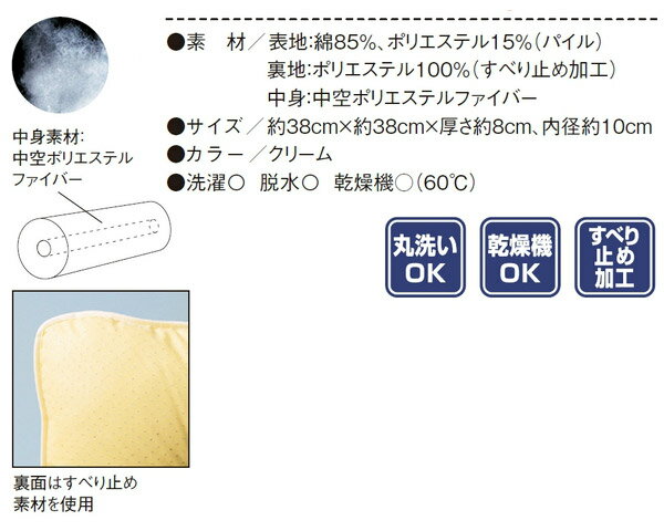 ●サイズ/約幅38×長さ38×厚さ8cm、中穴:約10cm●重さ/410g●材質/中材:ポリエステルファイバー、表地:パイル、裏地:ポリエステル100%(すべり止め加工)●生産国/日本●洗濯機可●脱水機可●乾燥機可(60℃)・丸洗いできる患部保護に適した床ずれ防止クッション。・ベッドや椅子などさまざまな場面で使用できる便利な角座。【エンゼル】