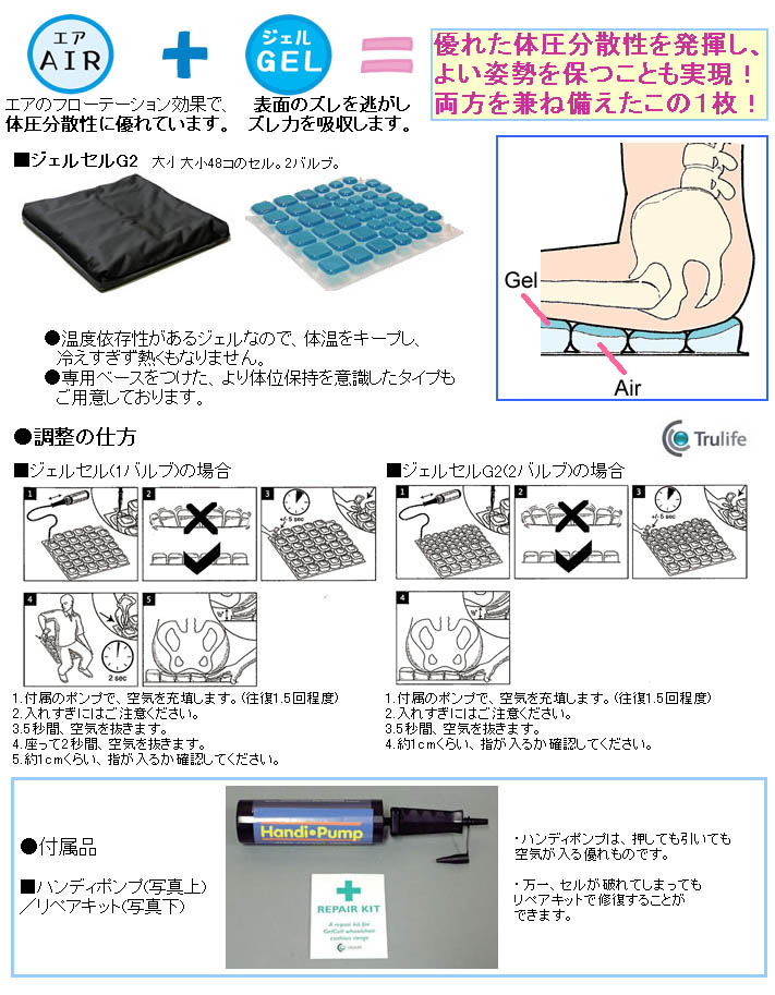 ※メーカー廃盤となりました。在庫限りとなりますので、万一品切れの際はご容赦下さい。 □型番/幅40cm(TC-GC2P-40)、幅38cm(TC-GC2P-38) ■サイズ/幅40×奥行40×厚さ6cm 幅38×奥行38×厚さ6cm ■重量/1.8kg(幅40)、1.6kg(幅38) ■材質/本体:ポリウレタンフィルム、シリコンジェル 専用ベース:ポリエステル ・大小48個のセル、2バルブです。 ・クッションを使用する目的である「快適性」「座位保持」「床ずれ予防」に優れた、今までにない、組み合わせの新しいクッションです。 ・より座位を安定させるための専用ベース付です。 ・ベースの素材はポリエステルで、通気性にも優れています 【カバーお手入れ方法】 ・カバーは通気性に優れながらも水分を中まで通しません。伸縮性にも優れています。 ・裏面は、全面滑り止め加工になっています。 ・カバーは洗濯していただけます。本体は、ふき取るだけで汚れも取れるのでお手入れも簡単です 【タカノ】