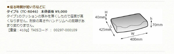 体圧分散性が高く、座り心地も快適な、多面体構造。 長い間座っていてもお尻が痛くなりにくい タイプ6・・座る時間が短い方などに。タイプ1のクッションの厚みを薄くしたので座面が高くなりません。肘掛けの高さやハンドリムへの距離があまり変わりません。 ・車いす使用時の悩みを解決、体圧分散&姿勢を保持するお助けクッション。 新しくなりました! より快適になりました。 ・柔らかいウレタンと硬いウレタンからなる多面体構造のタカノのクッションは、体圧分散性が良く、長時間でも快適にお座りいただけます。 ・高い体圧分散力の特殊構造とズレ・ムレにくい生地。 軽量なのも高ポイント! ・生地裏面に防水加工、表は通気性に優れています。 ・特殊ウレタンフォーム多面体構造。 ・カバー付。 ・体圧分散力No.1。 ※画面上と実物では多少色具合が異なって見える場合もございます。ご了承ください。 ※カバーは洗濯機で水洗いすることができます。 本体のウレタンフォームは水洗いできませんので、ご注意ください。 ●サイズ/幅40×奥行42.5×厚さ4cm(高部10cm) ●重さ/410g ●材質/特殊ウレタンフォーム、ポリエステル ●品番/TC-R046 ●JANコード/ ブラック:4523725004482 レッド:4523725004208 ブルー:4523725004130 ●生産国/日本 ●メーカー/タカノ