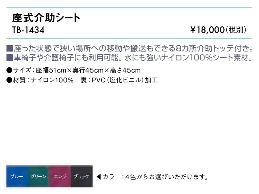 製品の仕様 サイズ 座幅51cm×奥行45cm×高さ45cm 材質 ナイロン100% 裏:PVC(塩化ビニル)加工 配送について 大型商品(大型宅配便)について お届けは玄関の前まで、ビルやマンションの場合は共同玄関口までの配達となります。配達員は1名でお伺いをいたしますので、トラックからの荷下ろし、 搬入が困難な場合、お客様にお手伝いをお願いしております。 再配達について 路線便での配送となるため、不在時の持ち帰りや再配達の際に別途費用が発生します。ご不明な点はお問い合わせください。 搬入・設置組立について 時間指定や階段を利用しての搬入、設置組立をご希望の場合も別途費用が発生します。必要な場合は予めご相談ください。 個人宅への配送について ご注文時の備考欄に(施設名・屋号・予定名称)をご記入ください。お届け先が個人様宛の場合、別途送料が必要です。 北海道・沖縄・離島へのお届けについて 追加送料が発生します。法人様につきましても追加送料分のご負担が必要です。 サポート情報 ※メーカー希望小売価格はメーカーカタログに基づいて掲載しています。TB-1434 座式介助シート 座った状態で狭い場所への移動や搬送もできる8カ所介助トッテ付き。車椅子や介護椅子にも利用可能。水にも強いナイロン100%シート素材。 カラーは4色からお選びいただけます。 高田ベッド製作所正規特約店のエンバシーで安心をプラス! ご注文はこちらから