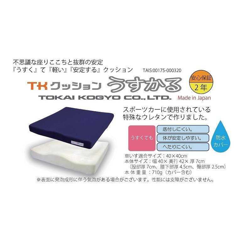 TKクッション うすかるは、スポーツカーに 使用されている特殊なウレタンで作ったクッションです。 不思議な座りここちと抜群の安定! 「うすく」て「軽い」「安定する」クッション!! うすくても底付きしにくい、体が安定しやすい、 へたりにくい。体に当たる面が軟らかく、沈み込む為 せん断力も少なく床ずれができにくい。 汎用ウレタンフォームに比べ硬度変化が小さく、 長時間、長期間使用してもクッション性を維持できる。 防水カバー仕様。 ・商品仕様 本体サイズ 幅40×奥行42×厚さ7cm (股部厚7cm、膝下部厚4.5cm、臀部厚2.5cm) 車イス適合サイズ 40×40cm 重量 710g(カバー含む)
