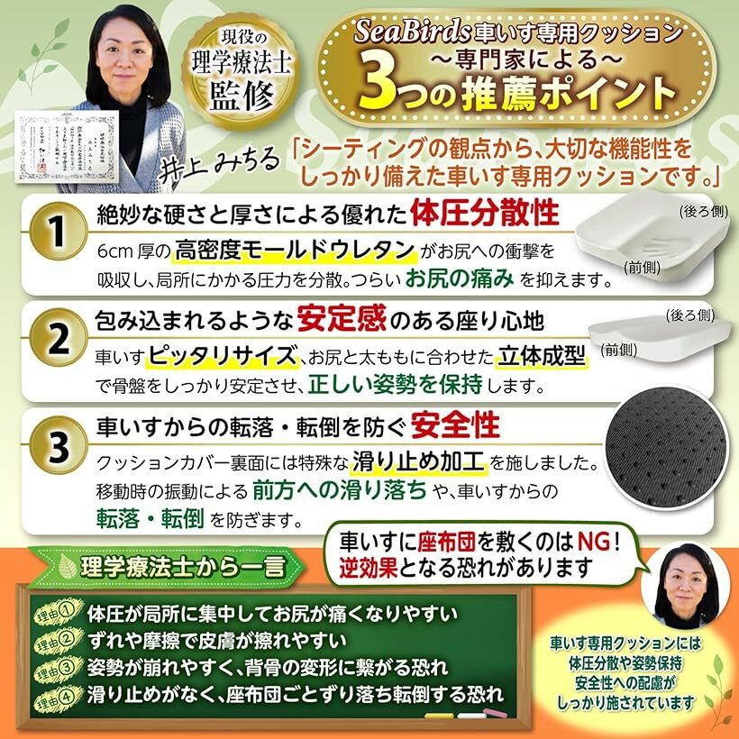 バリエーションコード : 2b4x0u6toh商品コード2b4x09iro2商品名車椅子用 クッション 座布団 理学療法士監修 介護 低反発 お尻が痛くならない x正しい姿勢を保つ立体成型 洗えるカバー 滑り止め 高密度モールドウレタン 1枚入 ブラックブランドSeaBirdsカラーブラックサイズ等1個 (x 1)「現役の理学療法士監修」 「車いすの方々のお尻の痛みを和らげて、たくさんの人に笑顔になってほしい」 そんな想いから生まれた車いす専用クッションです。理学療法士の監修のもと、車椅子用クッションに必要な機能、適した素材・形状等について、専門家と共に検討を重ねて作りました。「車いすクッションに必要な3つの機能」 (1)高密度モールドウレタン素材がお尻への衝撃を吸収、体圧を分散。お尻の痛みを和らげます。(2)車いすにピッタリのサイズと立体成型が骨盤をしっかりサポート。正しい姿勢を保持し、褥瘡(床ずれ)発生リスクや円背などの背骨の変形リスクを抑えます。(3)底面の滑り止め加工により、車いすからの転落・転倒を防ぎます。「大きめファスナーでカバーの付け外し簡単」 カバーは取り外して洗濯できます。また、カバーには開口部の広い大きめのファスナーを採用。カバーの付け外し、内部クッションの出し入れが簡単にできるように配慮しました。*登録商標 第6517703号※ 他ネットショップでも併売しているため、ご注文後に在庫切れとなる場合があります。予めご了承ください。※ 品薄または希少等の理由により、参考価格よりも高い価格で販売されている場合があります。ご注文の際には必ず販売価格をご確認ください。※ 沖縄県、離島または一部地域の場合、別途送料の負担をお願いする場合があります。予めご了承ください。※ お使いのモニタにより写真の色が実際の商品の色と異なる場合や、イメージに差異が生じることがあります。予めご了承ください。※ 商品の詳細(カラー・数量・サイズ 等)については、ページ内の商品説明をご確認のうえ、ご注文ください。※ モバイル版・スマホ版ページでは、お使いの端末によっては一部の情報が表示されないことがあります。すべての記載情報をご確認するには、PC版ページをご覧ください。