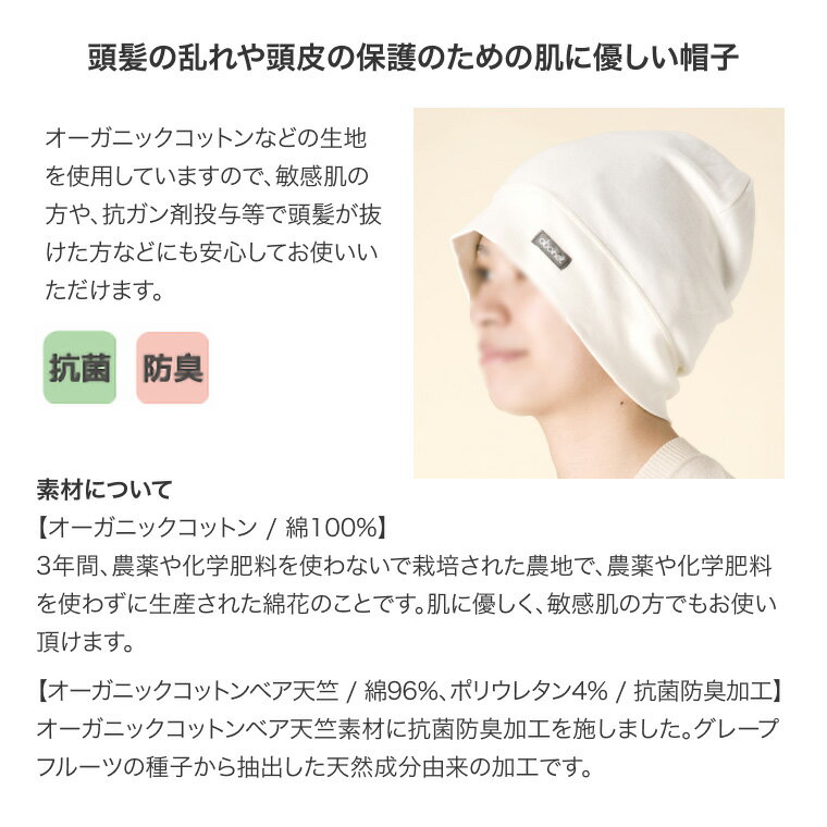 ●サイズ(頭囲)/S:50〜54cm、M:55〜59cm●重さ/約40g●材質/アイボリー・ブラウン:綿100%(オーガニックコットン)、ブラック:綿80%・レーヨン20%(キチンキトサン)●手洗い可●乾燥機不可●漂白剤不可●抗菌加工、消臭加工・日常生活において人と環境に優しい素材で作られたお肌を守る帽子です。・自宅・施設・病院での療養時、抗がん剤治療により頭髪を失った方、また、アトピー性皮膚炎等の敏感肌の方にもおすすめです。・頭髪の乱れや頭皮の保護のための肌に優しい帽子です。・素材にはオーガニックコットンなどの生地を使用していますので、敏感肌の方や、抗ガン剤投与等で頭髪が抜けた方等にも安心してお使いいただけます。※転倒保護を目的とした帽子ではないため、衝撃緩衝材は入っておりません。【特殊衣料】