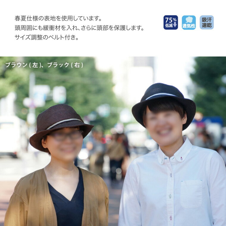 ●サイズ(頭囲)/56〜58cm●重さ/約170g●材質/表地:レーヨン72%・ナイロン28%、裏地:ポリエステル100%(清涼裏地)、緩衝材:PORON+メッシュ(厚さ約1.5cm)●リスク低減率/75%●ドライクリーニング可●吸汗速乾加工・春夏仕様の表地を使用しています。・頭周囲にも緩衝材を入れ、さらに頭部を保護します。・サイズ調整のベルト付き。 【特殊衣料】