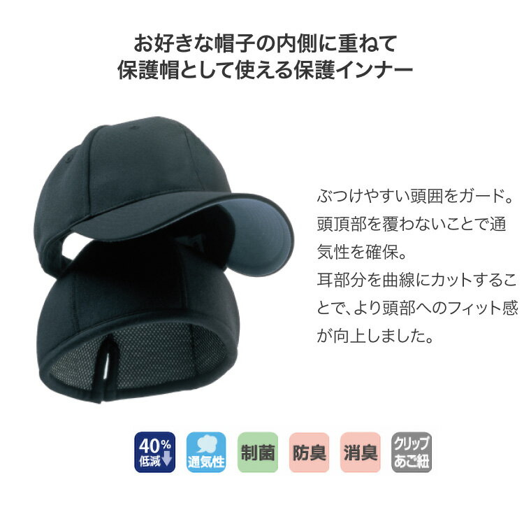 ●サイズ(頭囲)/56〜58cm、59〜61cm●重さ/56〜58cm:約90g、59〜61cm:約100g●材質/緩衝材:PORON+メッシュ、表地:綿80%・レーヨン20%(キチンキトサン)●生産国/日本●手洗い可●洗濯機可(ネット使用) ・お気に入りの帽子も保護帽に。お手持ちの帽子につけるだけ!・頭頂部を覆わないことで高い通気性を確保。・耳部分を曲線にカットすることで、より頭部へのフィット感が高まりました。※1cm程度の厚みがありますので、アウターの帽子は通常よりもひと回り大きなものをご用意ください。 【特殊衣料】