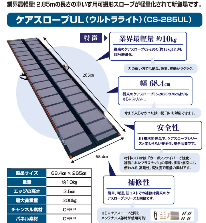 商品の仕様 ●サイズ/幅68.4×長さ285cm ●重さ/約10kg ●材質/CFRP ●エッジ高さ/3.5cm ●耐荷重/300kg 商品の説明 ・従来のケアスロープの機能をそのままにさらに軽量化・幅を狭くした車いす用スロープです。 ・持ち運びがラクになったことで、より多くの方が利用できるようになり、今までスロープをかけられなかった狭い間口にも対応可能です。