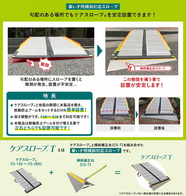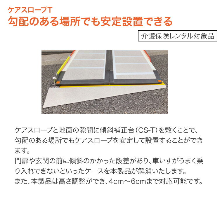・車いす用傾斜対応スロープ。勾配のある場所でもケアスロープを安定設置できます!・ケアスロープと地面の隙間に傾斜補正台(CS-T)を敷き、脱輪防止アームをセットするだけの簡単設置!・高さ調整ができ、4〜6cmまで対応可能です!・脱輪防止アームを付け替えることで左右どちらでも設置可能です!※ご使用の際には必ず介助者が付き添ってください。【ケアメディックス】
