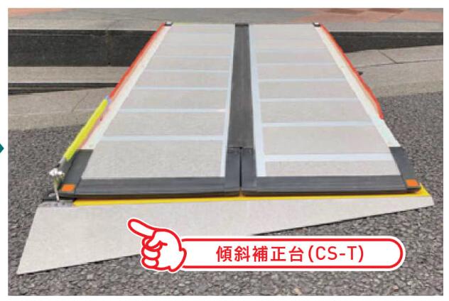 勾配がある場所でケアスロープ設置を可能にする傾斜補正台 CS-T ※本製品は補助パーツであり、スロープ本体は付属しませんのでご注意ください。 坂道の途中など勾配のある場所で、ケアスロープと地面の隙間にこの傾斜補正台(CS-T)を敷くことで、勾配のある場所でもケアスロープを安定して設置することができます。 門扉や玄関の前に傾斜のかかった段差があり、車いすがうまく乗り入れできないといったケースを本製品が解消いたします。 ●水勾配などによる設置時のガタツキを解消できます ●左右どちらにも対応ができる脱輪防止アーム付き ●対応スロープ/CS-120~CS-285C ●規格 ・重量:約3kg ・サイズ:奥行290~300×幅750mm ・高さ調整範囲:4cm~6cm(※1) ・材質:ステンレス、樹脂 ・脱輪防止アームの長さ:375mm ・耐荷重:300kg(※2) (※1) 地面から4cm~6cmの高さの範囲で調整することができます。 (※2) スロープにセットした状態の耐荷重になります。 ※別売のケアスロープ(CS120、CS150、CS175、CS200、CS240C、CS285C)とセットでご使用ください。 ※使用される際には、必ず介助者が付き添ってください。 ※高さ最低位置4cm・最高位置6cm以内で必ずご使用ください。 ※付属の六角レンチ(4mm)を使い脱輪防止アームを付け替えることで、左右反転して設置することができます。