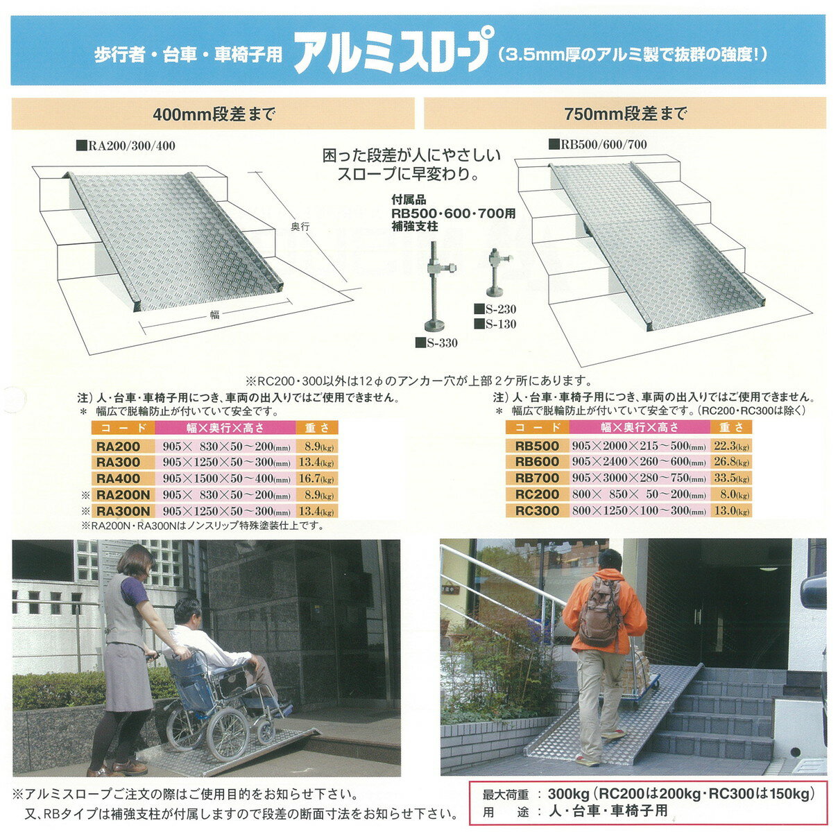 商品名 : 【段差スロープ】【階段】歩行者・台車・車椅子用 アルミスロープ 400mm段差まで RA300 W905×D1250×H50〜300mm 13.4kg
