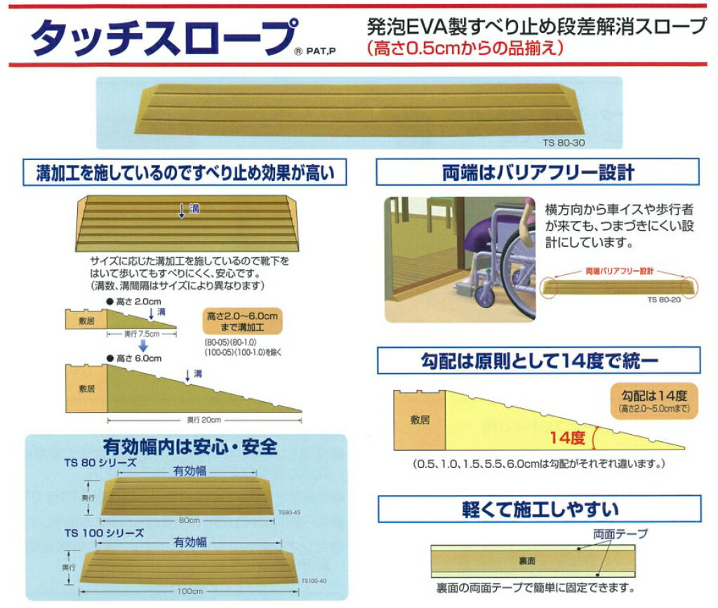 商品名 : 段差解消スロープ タッチスロープ TS80-25(幅80cm×高さ2.5cm) シンエイテクノ (転倒防止 段差スロープ 段差プレート/段差解消スロープ 介護 用 スロープ 軽量) 介護用品